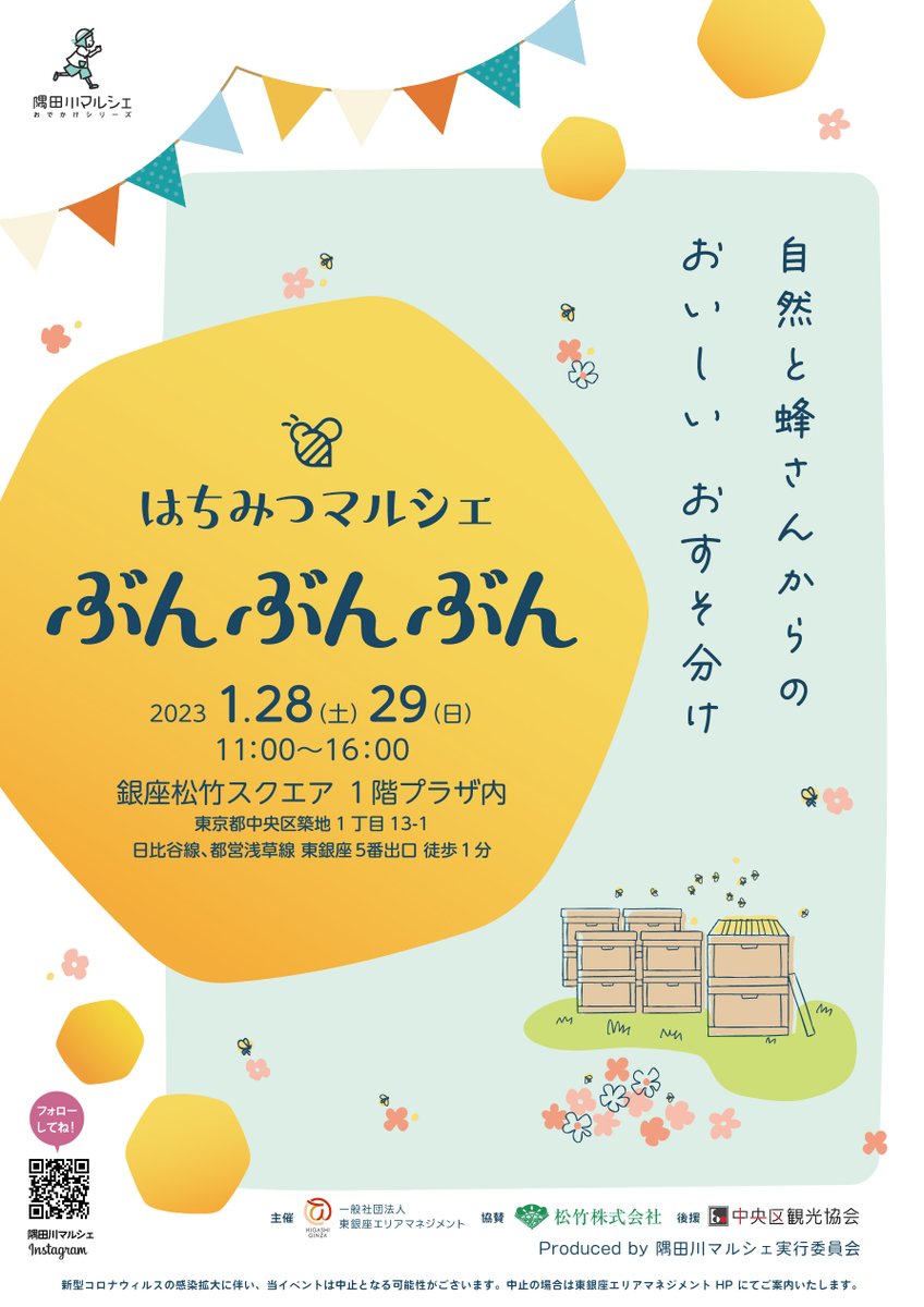 隅田川マルシェが街に飛び出してマルシェを実施する「おでかけシリーズ」がスタート初回は、はちみつマルシェ「ぶんぶんぶん」。東銀座にある松竹スクエアで。遊びにきてくださいね〜会場:銀座松竹スクエア 日時:..