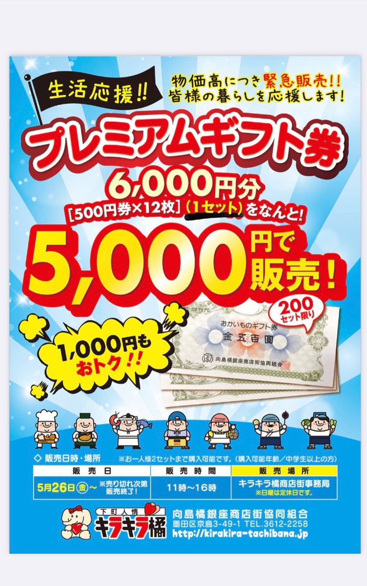 本日11時より、キラキラ橘商店街プレミアムギフト券の販売を致します😊限定200セット限り、無くなり次第終了となりますので、お早めにお買い求め下さいね😊#下町人情キラキラ橘商店街#キラキラ橘プレミアムギ..