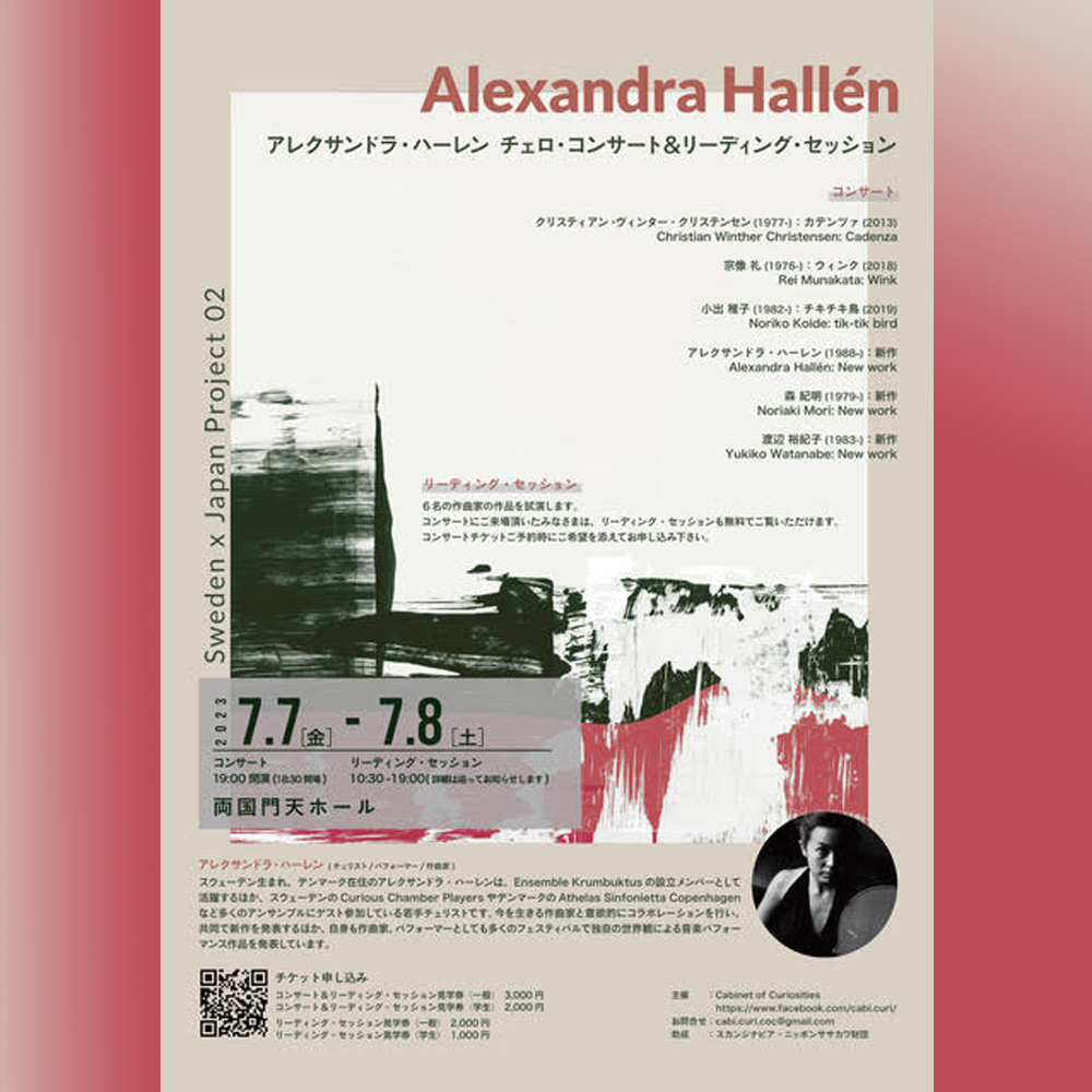 7/7/金 19:00〜7/8/土 10:30〜CabinetofCuriositiesSweden×JapanProject02アレクサンドラ・ハーレンチェロ・コンサート&リーディング・セッション主..