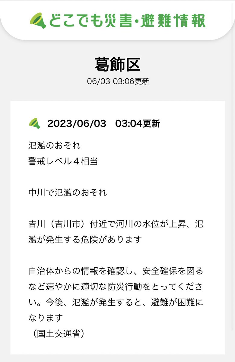 中川と綾瀬川で氾濫の恐れ 墨田区が浸水する恐れはありません! 近隣の葛飾区、足立区、江戸川区を対象に、河川氾濫の危険があるとして緊急速報エリアメール、緊急速報メールが発信されました。 #墨田区