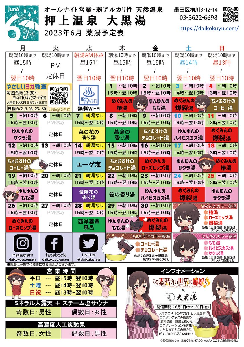 6月の薬湯予定表が完成いたしました! 今月のオススメは「このすば」とのコラボ湯!めぐみん、ゆんゆん、ちょむすけをイメージしたカラーの薬湯となっております!どうぞお楽しみに✨ #このすば #konosuba #大黒湯 #薬湯予定表