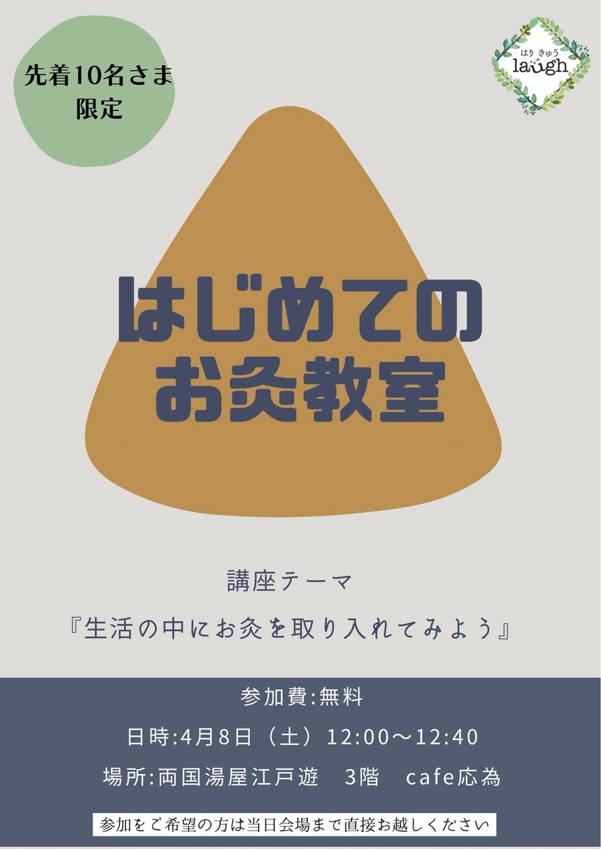 明日4/8(土)は「はじめてのお灸」体験教室を開催します🌋お灸のプチ講座&無料体験ができます😊いま、お灸は若い方・働き盛りの方のご利用もとても増えています!少しでも興味があれば、お気軽にご参加ください..