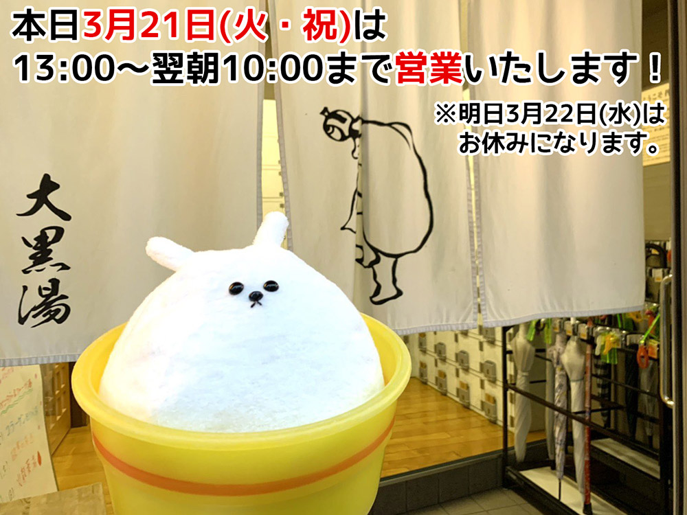 本日3月21日(火・祝)は13:00~翌朝10:00まで営業!日替わり薬湯は「純なまハーブ ラベンダーの湯」です♨本日は火曜日ですが祝日のため営業いたします!(明日3/22はお休みです)皆様のご来店を..
