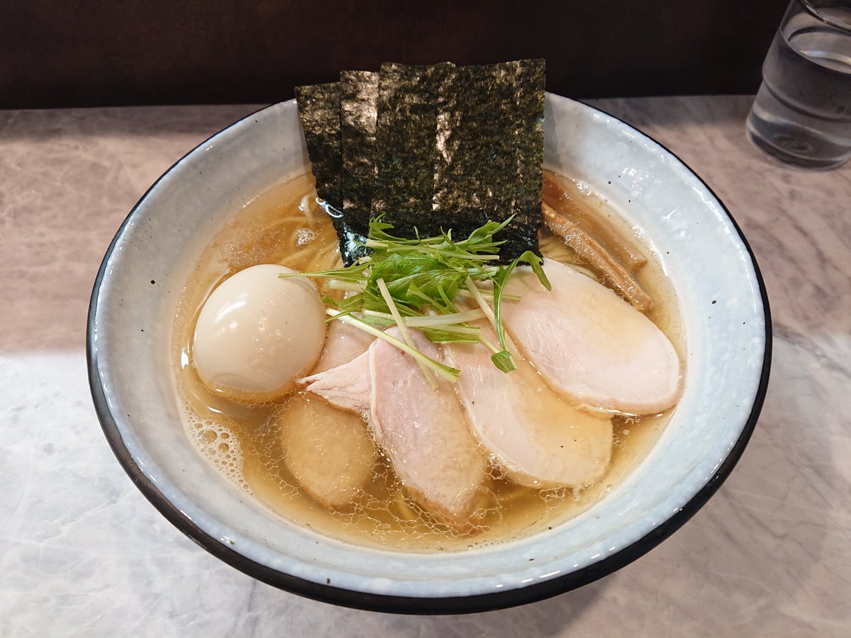 「麺響 万蕾」菊川 全乗潮らーめん じゅわっと広がる煮干しの旨み、そして貝の滋味💫鼻をくすぐる炙った魚介のような香ばしさ✨つるつるっと滑らかで心地よい歯応えの麺がよく馴染みます😊✨トッピング類との調和も印象深い、実に鮮やかな逸杯😋👍