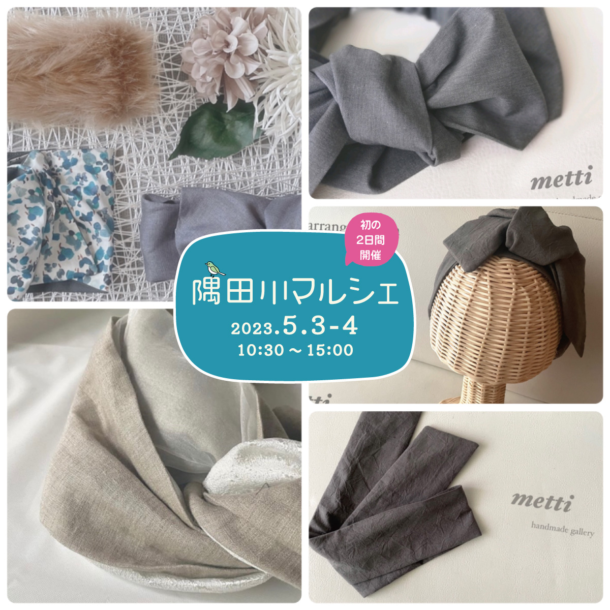 5/4#隅田川マルシェ出店者:Mettihandmadegalleryさん輸入生地やリネンを使った他にはないデザインのおしゃれなヘアバンド屋さんです。sumidagawa.square.site越中島..