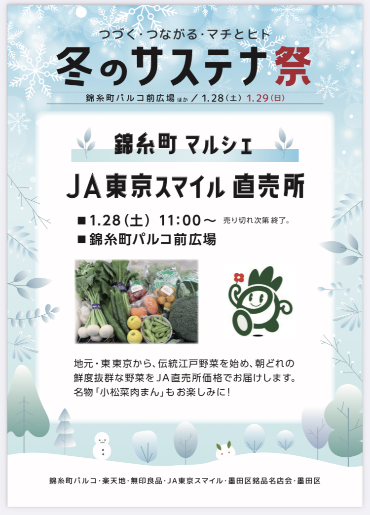 2023年1月28日(土)29日(日)冬のサステナ祭りが錦糸町PARCO前広場などで行われます。 …