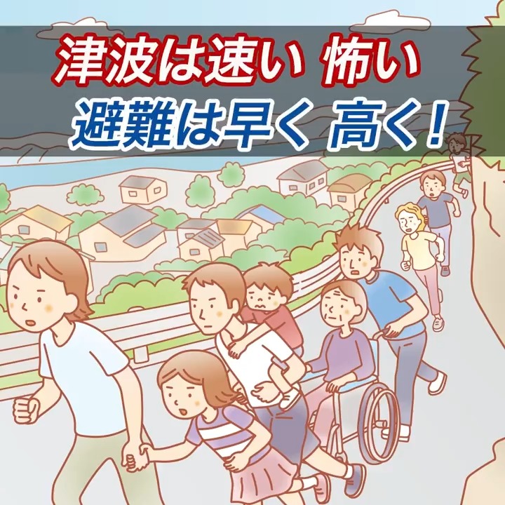 / 津波は速い、怖い 避難は早く、高く \ 津波は膝くらいの高さでも人を押し流す威力があります。 そして津波は速いので見えてからでは逃げ遅れてしまうのです。 津波警報が発表されたら、より高い場所にできるだけ早く避難してください。