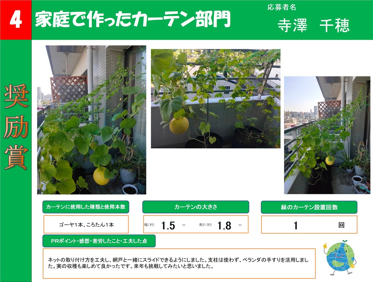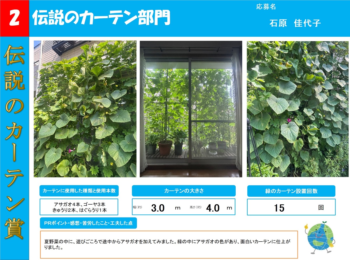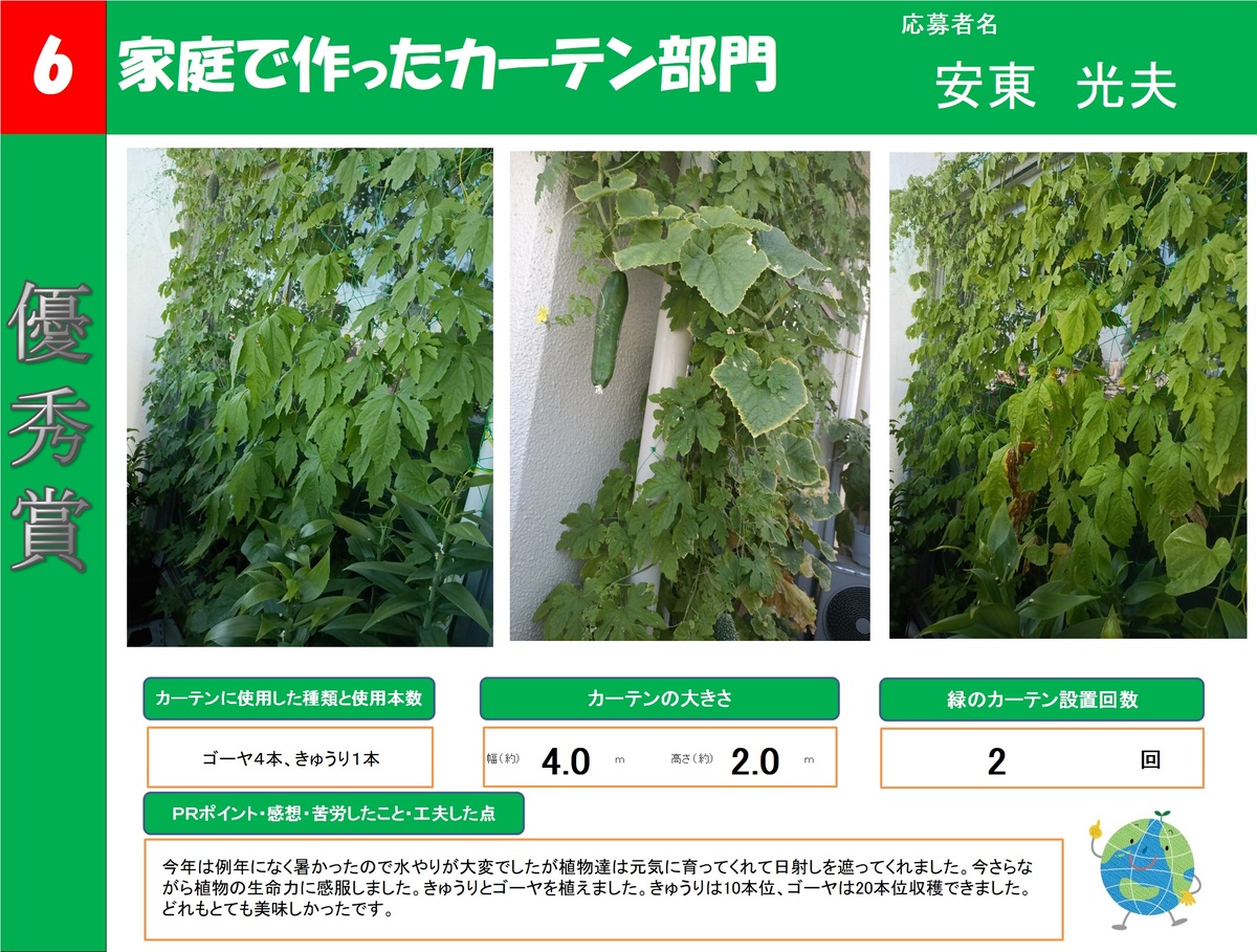 2025年度の緑のカーテンコンテストには、家庭でつくったカーテン部門11作品、みんなで作ったカーテン部門16作品、伝説のカーテン部門7作品のご応募がありました。その中から、各部門の入賞作品をご紹介します。