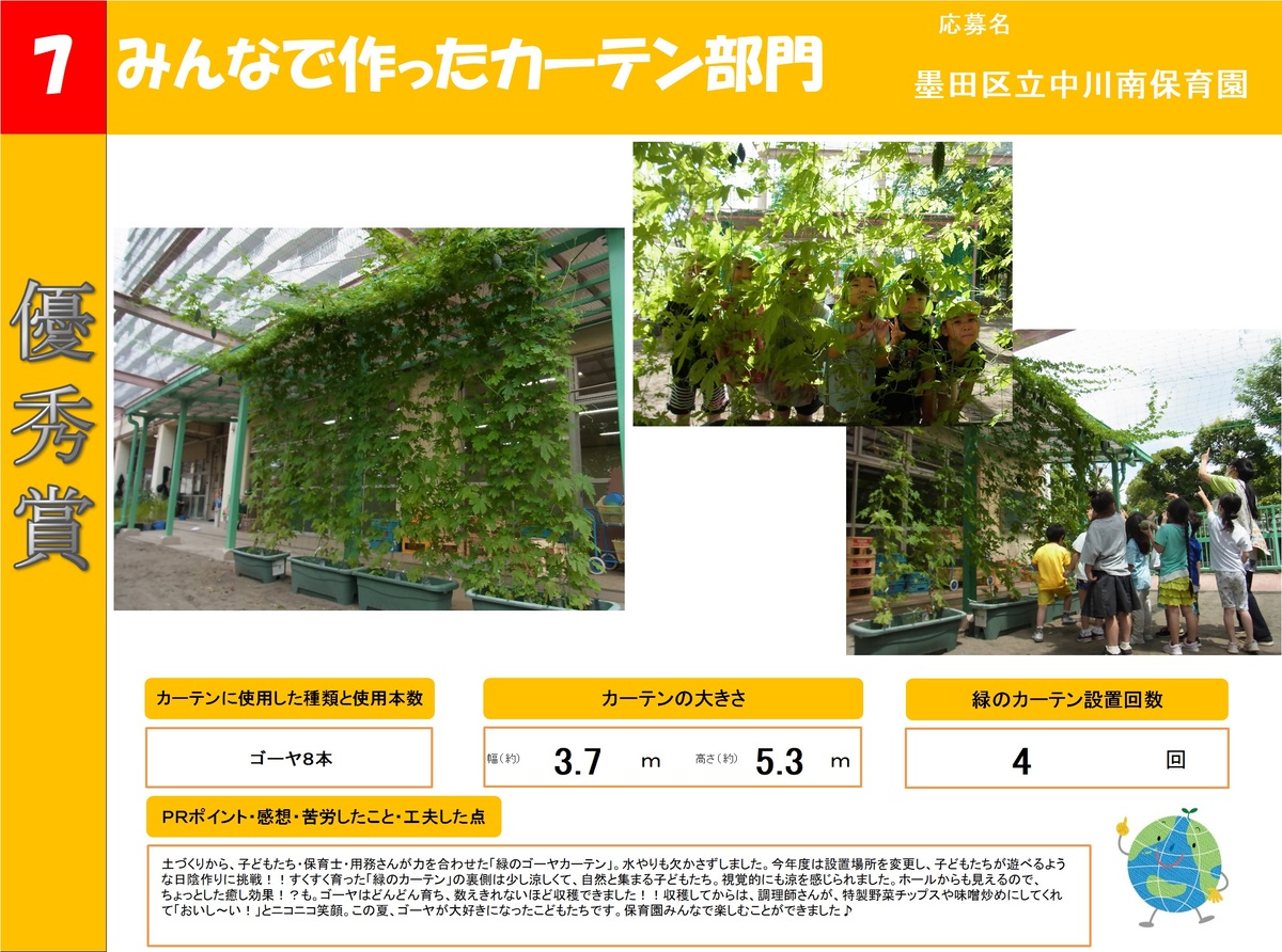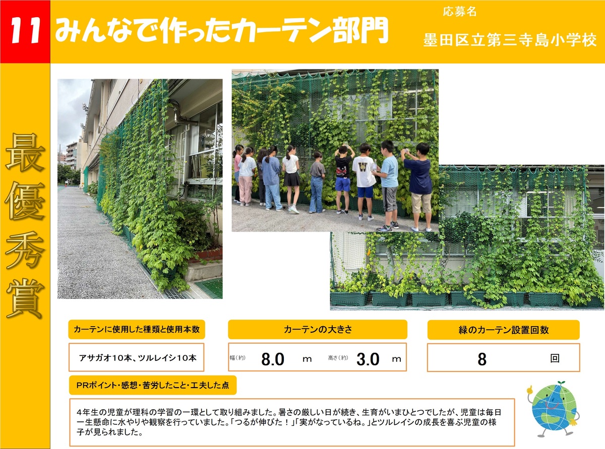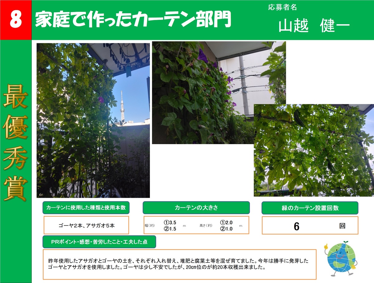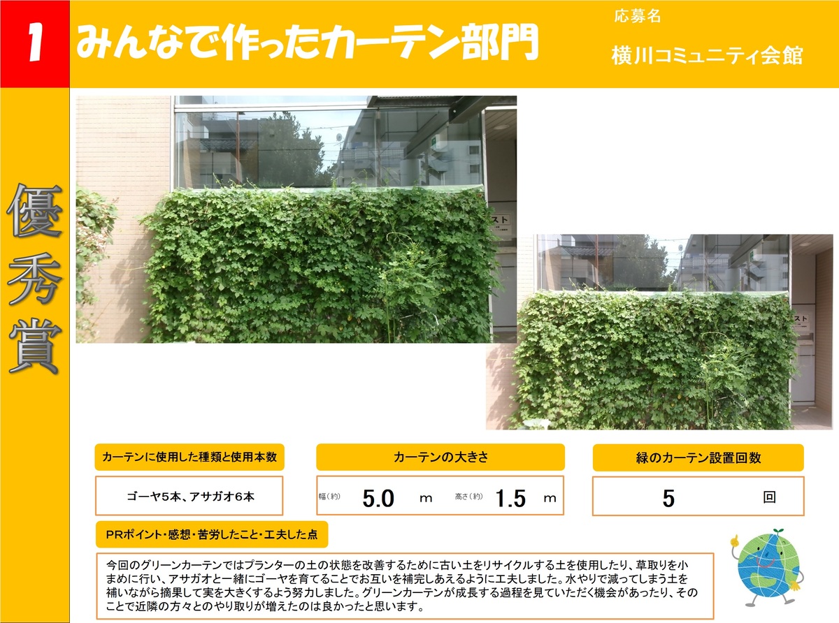 2025年度の緑のカーテンコンテストには、家庭でつくったカーテン部門11作品、みんなで作ったカーテン部門16作品、伝説のカーテン部門7作品のご応募がありました。その中から、各部門の入賞作品をご紹介します。