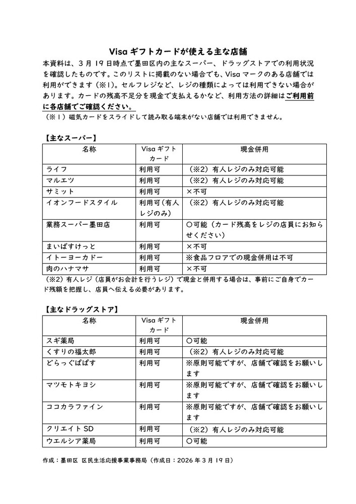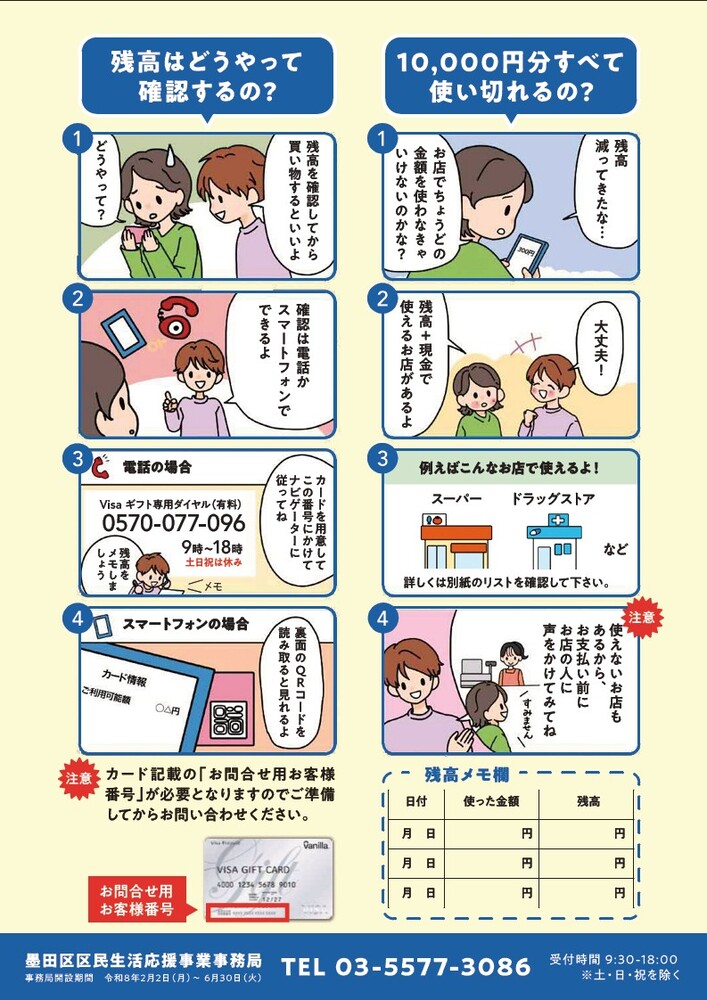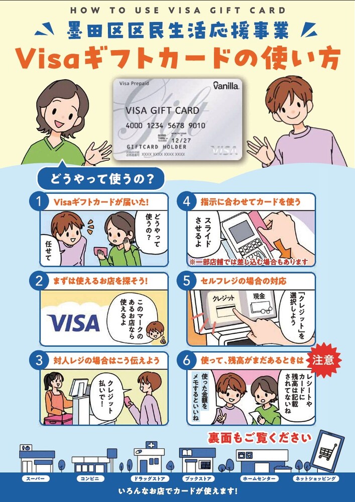 令和8年2月10日より受け付けしている「区民生活応援事業」において、7割以上の方から【Visaギフトカード】のお申し込みをいただいております。それに伴い、Visaギフトカードの使い方に関するお問い合わせも大変増加しておりますので、区民生活応援事業事務局にてVisaギフトカードの使い方をわかりやすくご案内するためのチラシを作成いたしました。これから使用する方や、残高の確認方法・使い切り方に困っている方はぜひダウウンロードしてご活用ください。