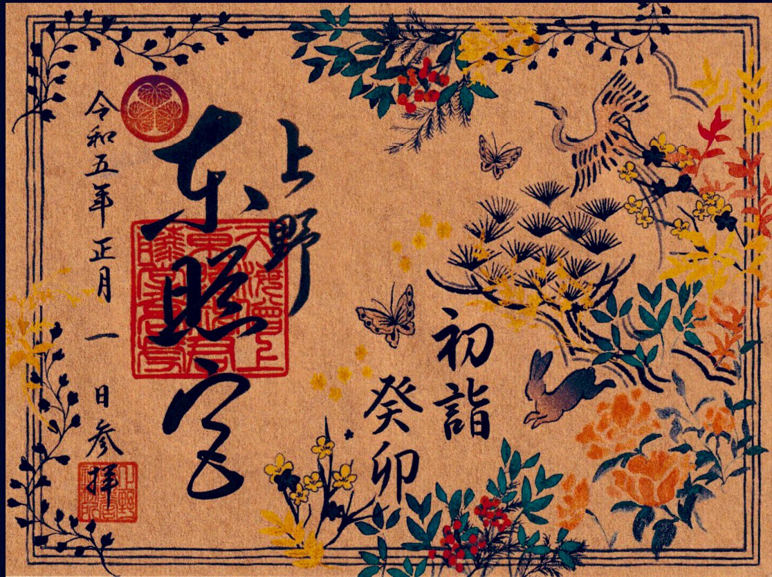 来月(令和5年1月)お分かちする月ごとの御朱印〈睦月〉は十二支の卯やぼたん苑の牡丹、また松や千両などの境内の草木を金色の和紙に描いた新年らしい御朱印です。