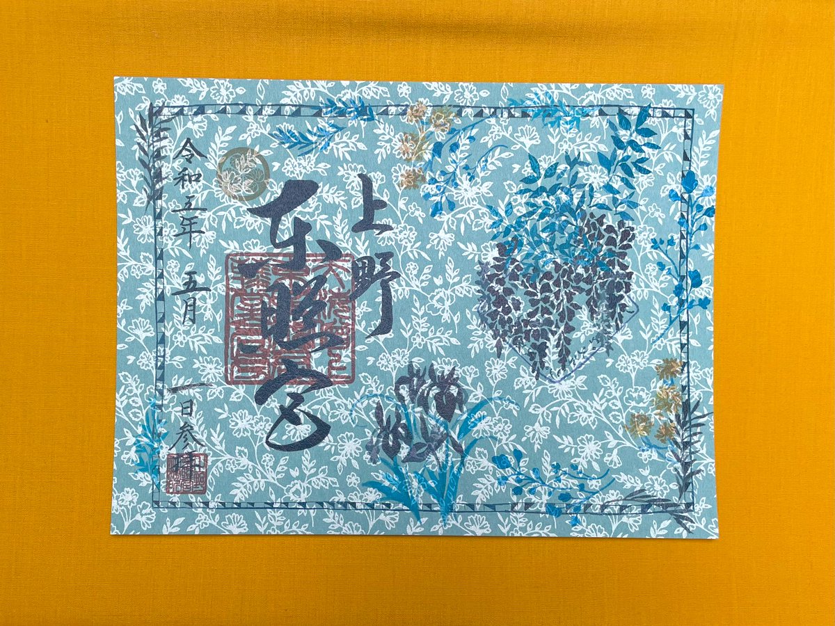 光の角度で草花が煌めく紙に、藤や菖蒲など境内の春の花々を描いた美しい御朱印です。