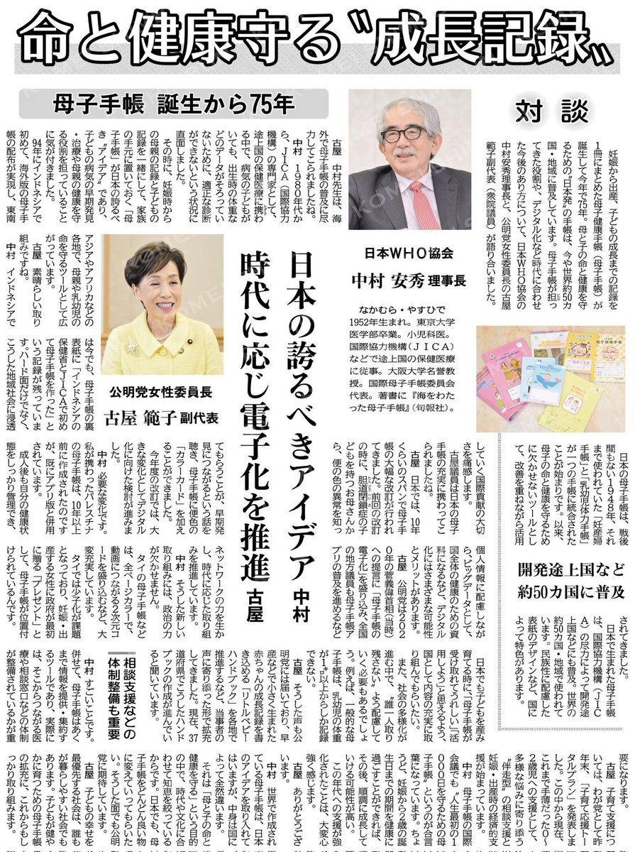 (対談 母子手帳誕生から75年)命と健康守る“成長記録”/日本WHO協会・中村安秀理事長×公明党女性委員長・古屋範子副代表 #公明新聞電子版 2023年05月28日付 www.komei.or.jp/newspaper-app/
