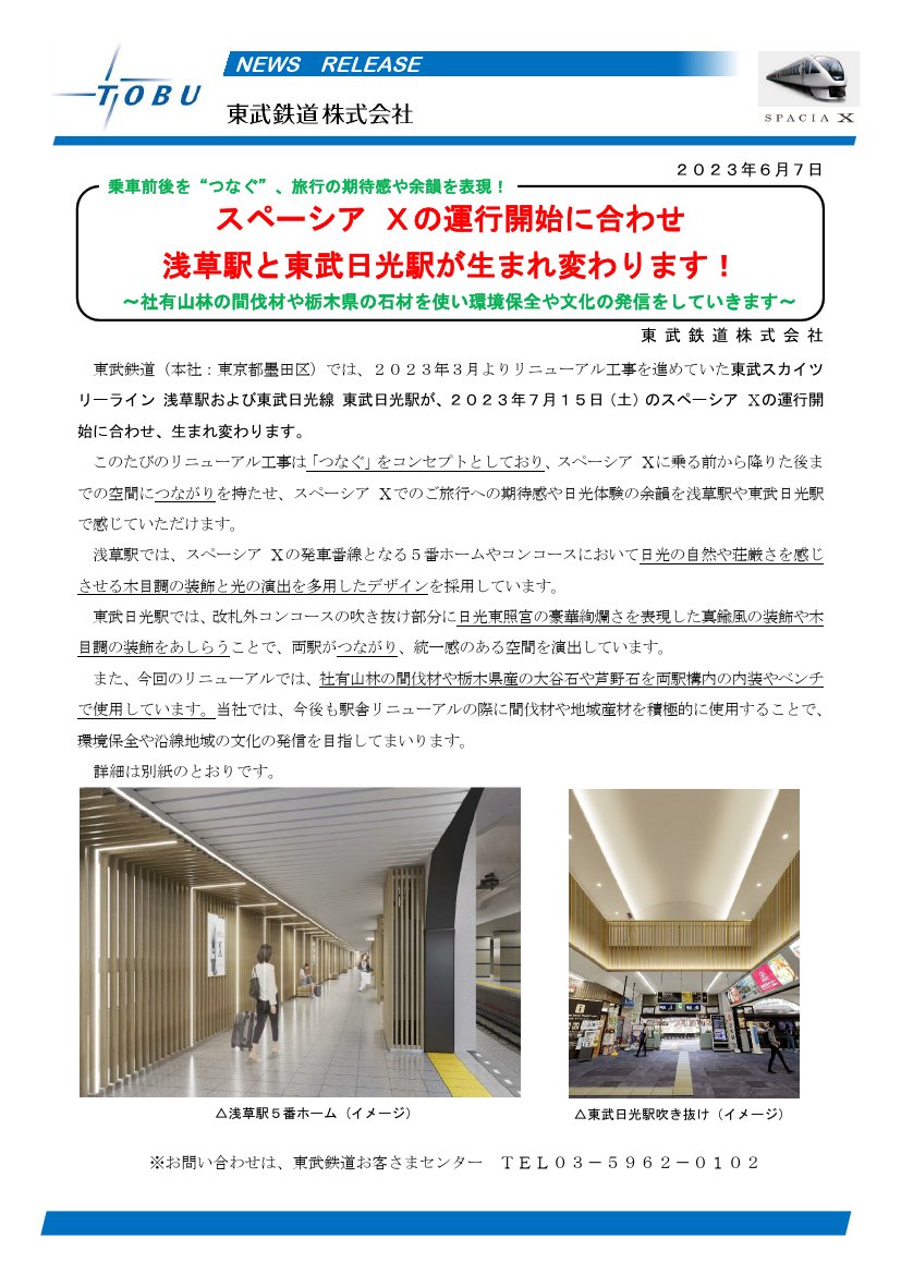 <東武鉄道>スペーシア Xの運行開始に合わせ 浅草駅と東武日光駅が生まれ変わります! 6月7日11時発表 www.tobu.co.jp/cms-pdf/relea..