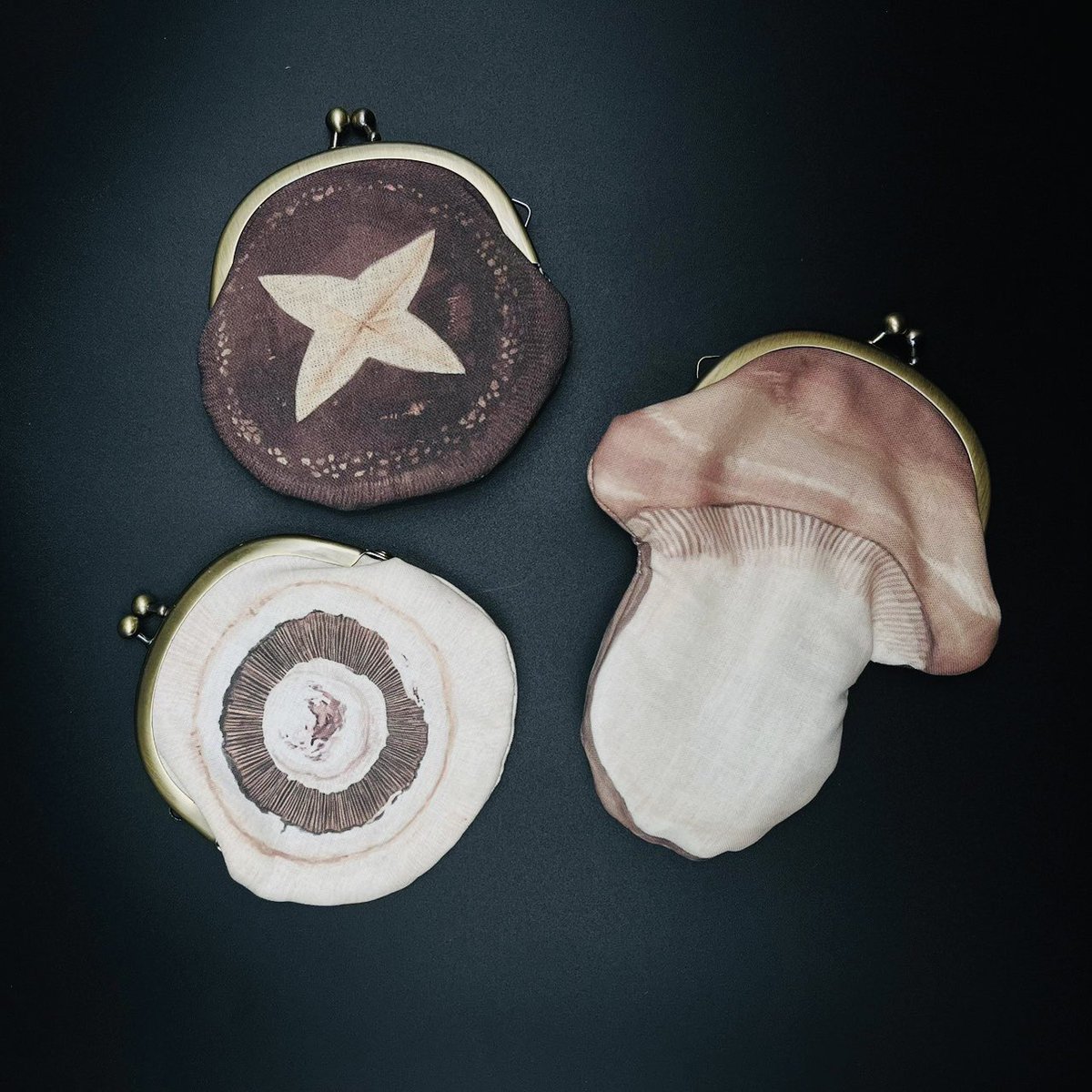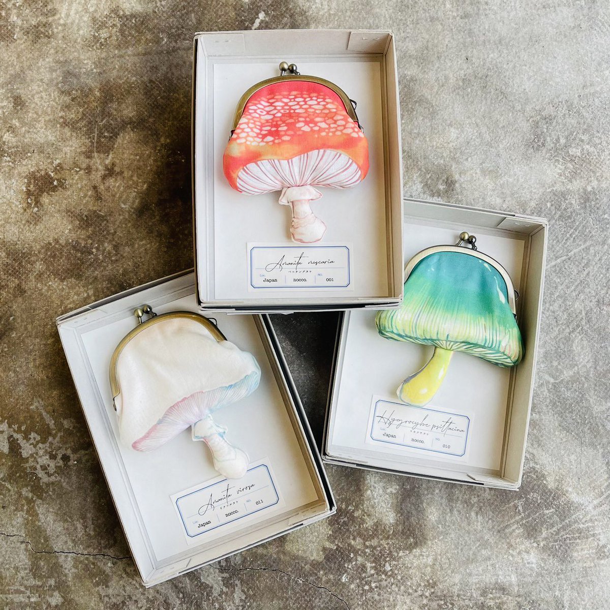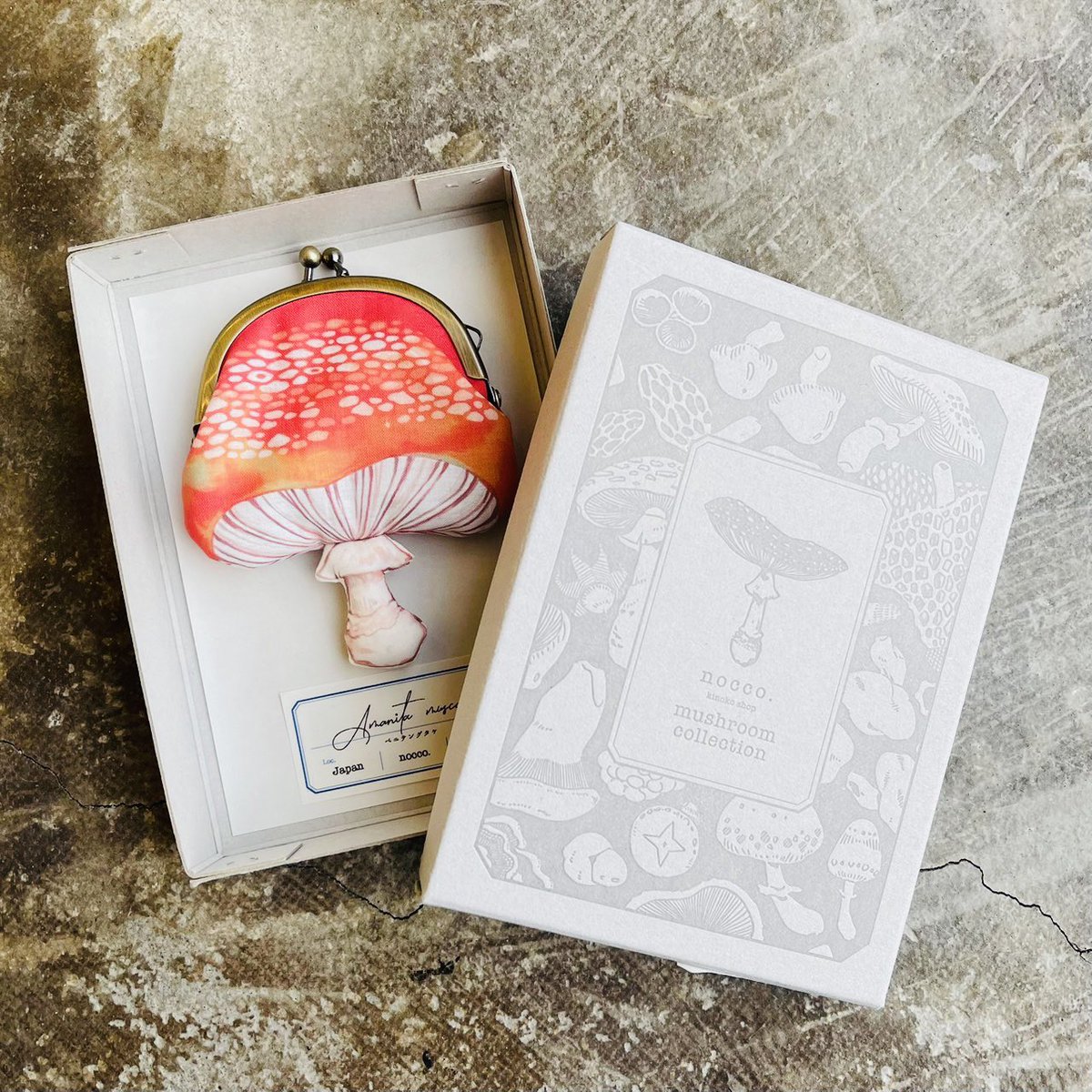 【きのこづくしフェア販売商品】ウサギノネドコ東京店では、nocco.( @_noco_noco_ )の作品を販売しています。ご紹介の作品はきのこのがま口。がま口シリーズは、図鑑で見るようなベニテングタケもあれば、美味しそうな食べられるシイタケも。標本やきのこ図鑑をイメージし紙箱に収められています。
