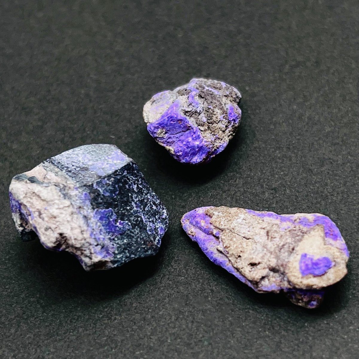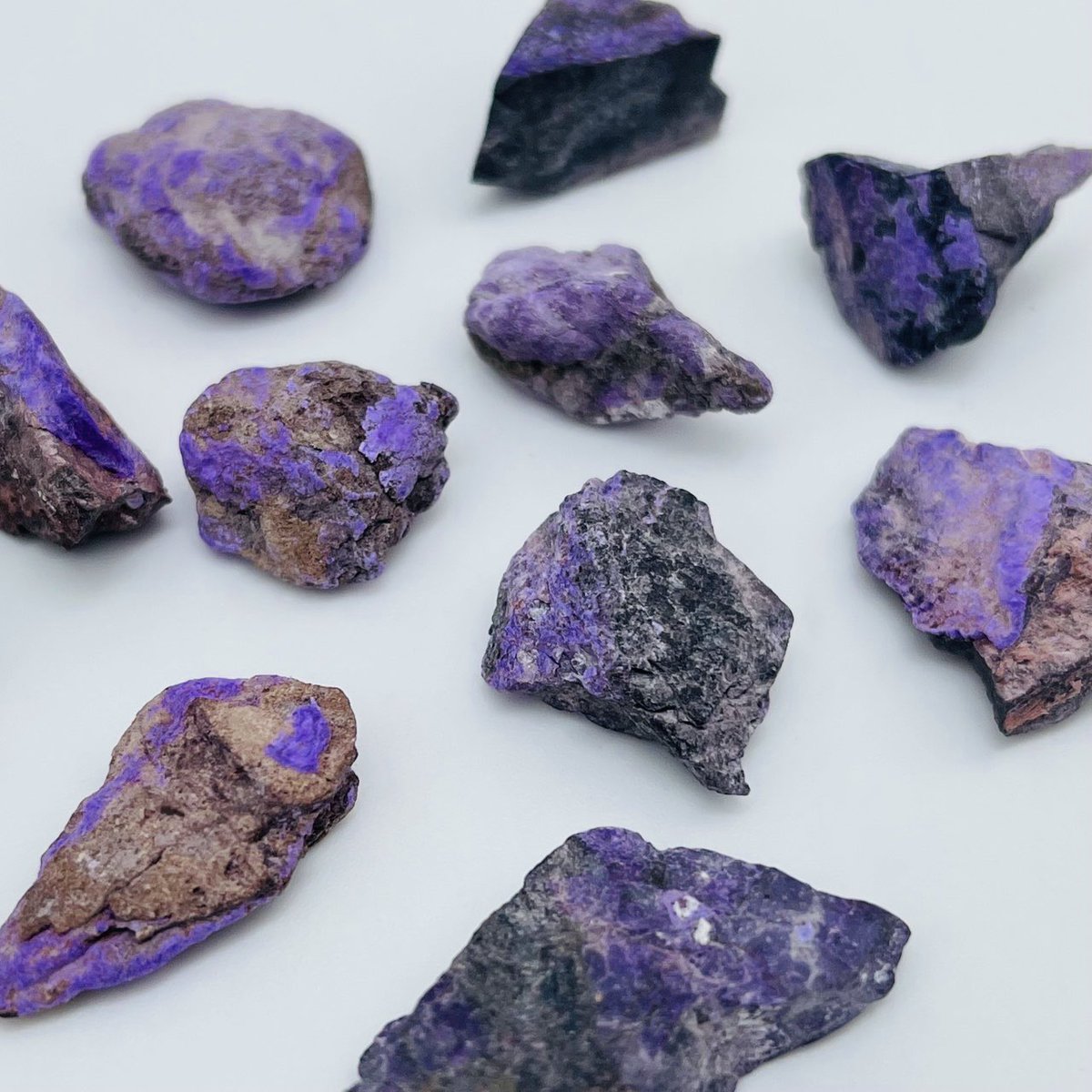 本日ご紹介するのは「スギライト」です。日本の愛媛県岩城島で杉健一らにより1944年に採取され、1974年に新鉱物として認定されました。当時見つかったのはうぐいす色の鉱物だったそうですが、現在主流なのは深い紫色。黒や茶色の母岩から覗く鮮やかな紫のスギライトのコントラストが美しい標本です。