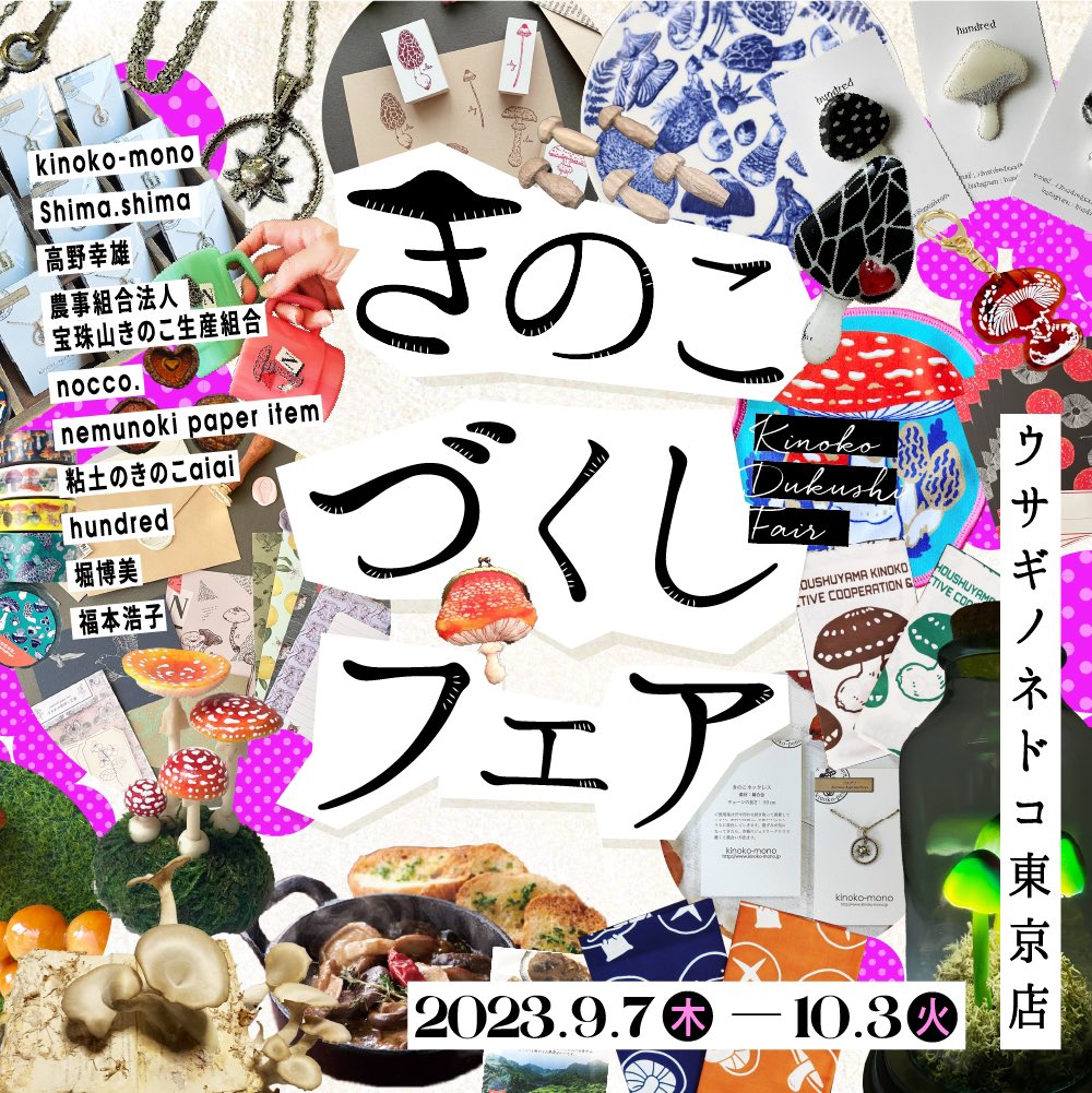 【きのこづくしフェア販売商品】ウサギノネドコ東京店では、粘土のきのこaiai( @aiaitukasa )の作品を販売しています。ご紹介の作品は、樹脂粘土で表現したシメジとタマゴタケのオブジェ。シメジは、カサの表面がうすい灰色をしていて、丸くてハリのある特徴を再現しています。