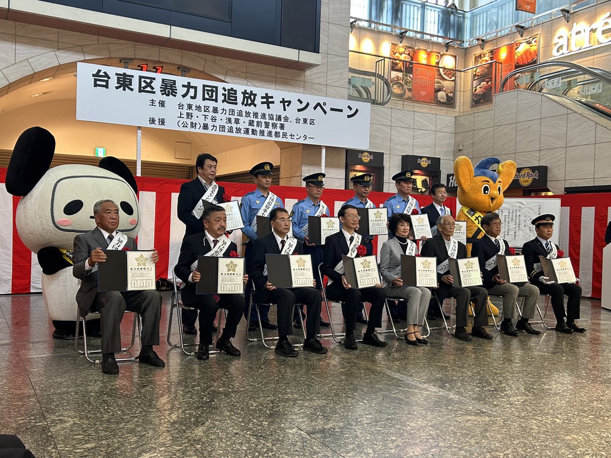 昨日、台東区町会役員表彰式が終了後に上野駅構内「ガレリア」にて、台東区暴力団追放キャンペーンが開催され、来賓として議長とともに参加しました。