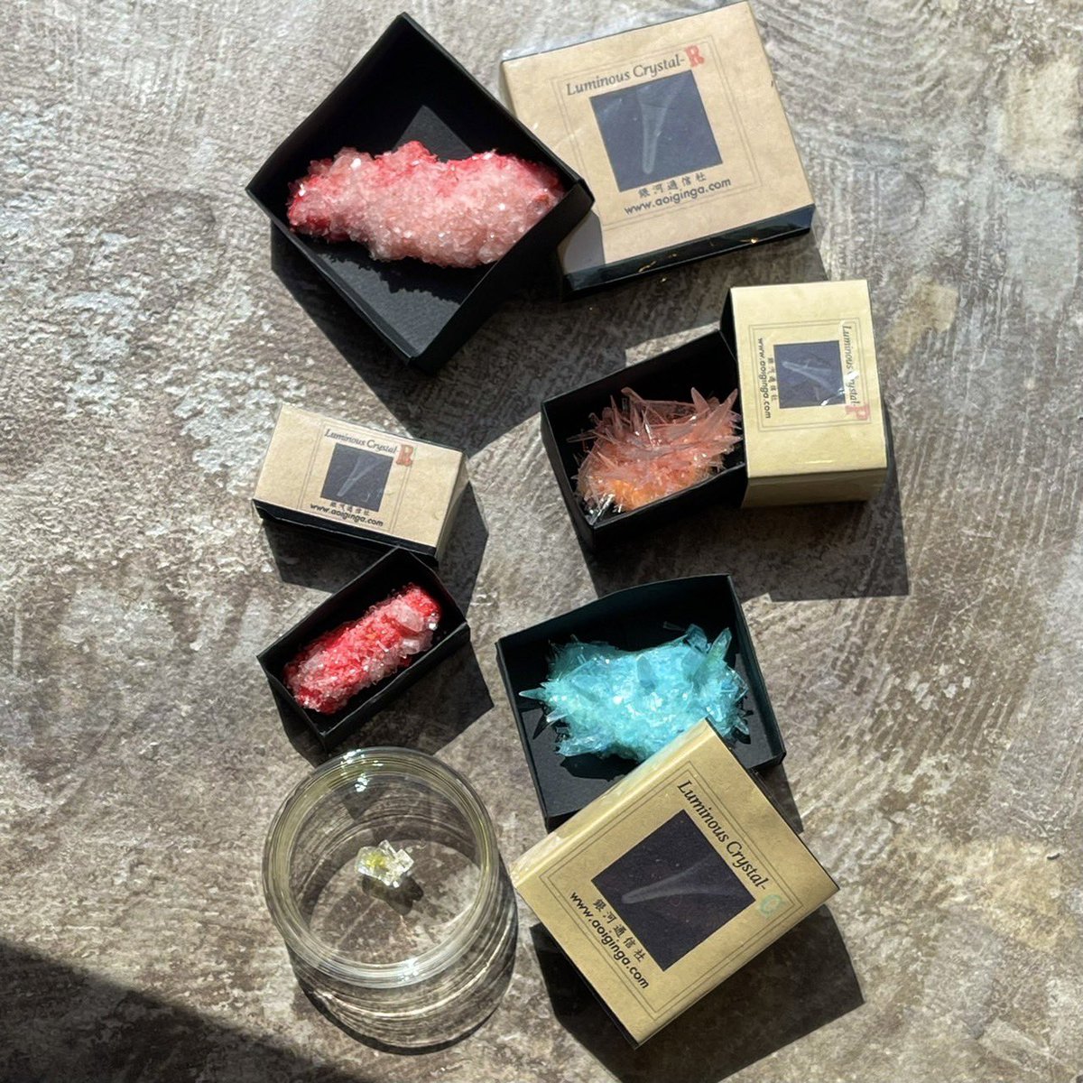 【石と光展販売商品】ウサギノネドコ東京店では、銀河通信社の小林健二さんの作品を販売しています。ご紹介の作品は、蓄光・蛍光する結晶です。蓄光結晶(箱入り)はしばらく光を当てると暗所で光り、蛍光鉱物(シャーレ入り)はUVライトを当てると光ります。鮮やかな光が美しい結晶たちです。