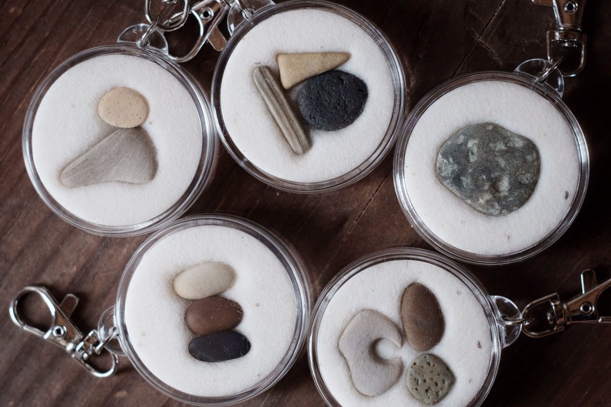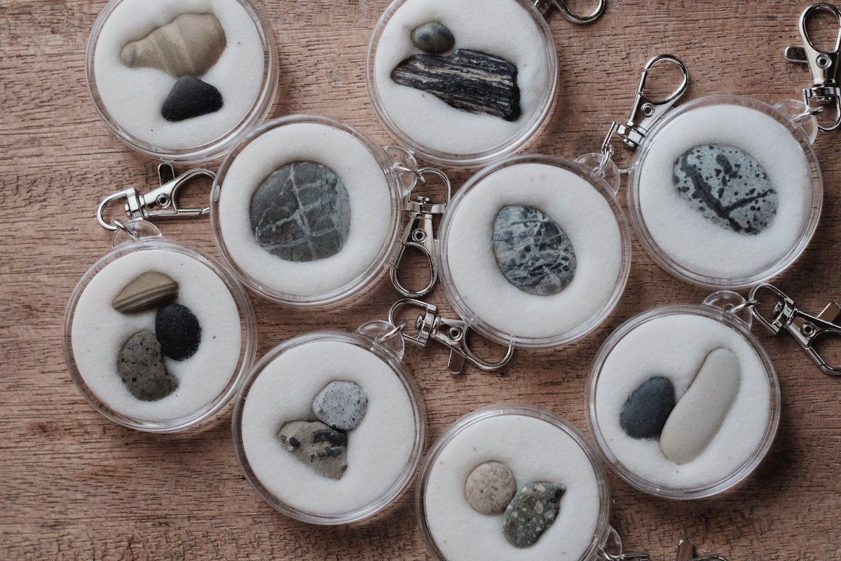【天体フェア 販売商品】ウサギノネドコ東京店では石好きださん( @ishisukida )の作品を販売しています。ご紹介の作品は、標本キーホルダー。プラスチック製のシャーレに、国内各地で拾い集めた石ころを収めています。惑星のようなまん丸の石など。カバンや鍵につけてお楽しみください。