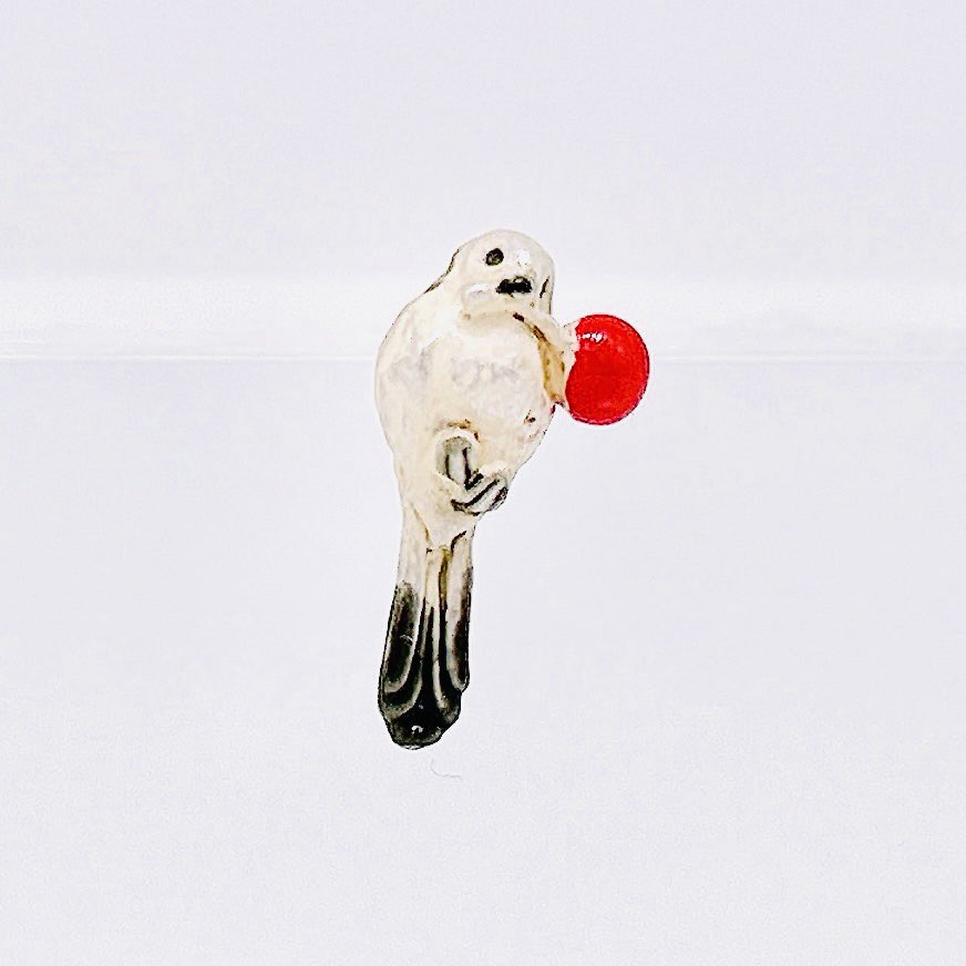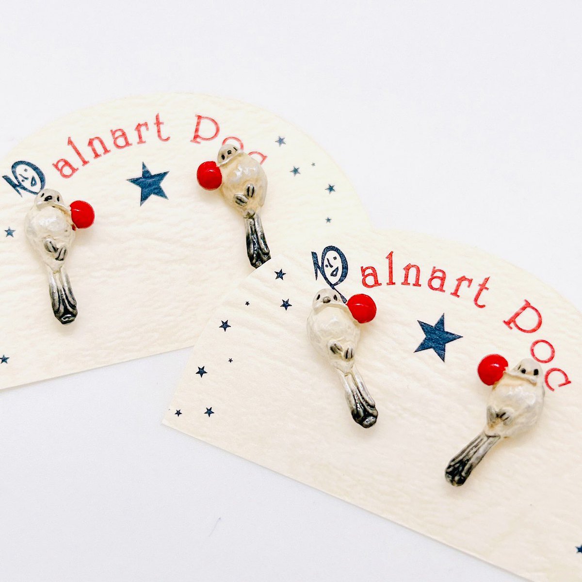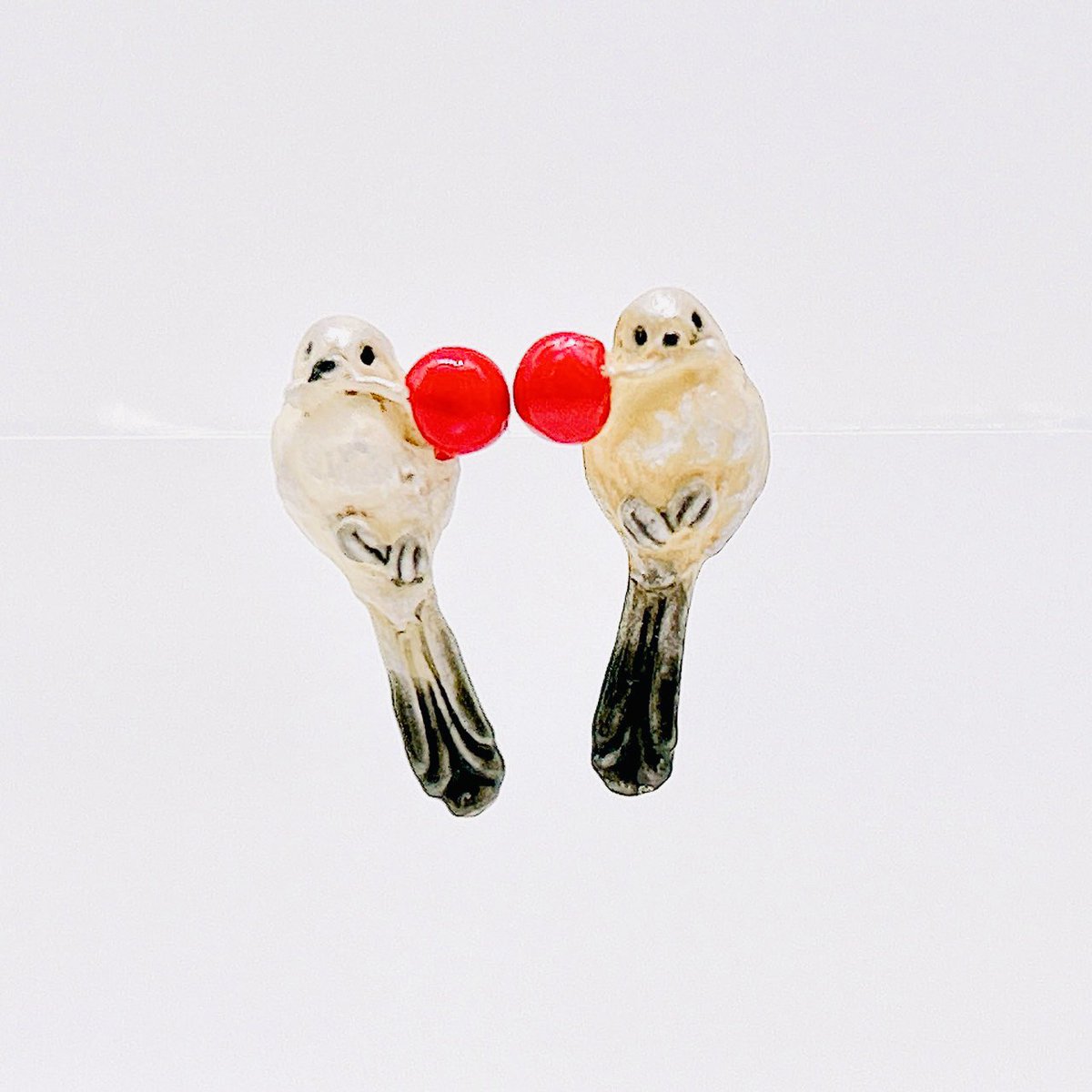 【鳥フェア販売商品】ウサギノネドコ東京店ではパルナートポック( @palnartpoc )の作品を販売しています。ご紹介の作品は、「シマエナガピアス」。南天の実を咥えている小さなシマエナガの可愛らしいピアスです。白くふわふわな毛や、黒い尻尾や翼が小さいながらも細かく再現されています。