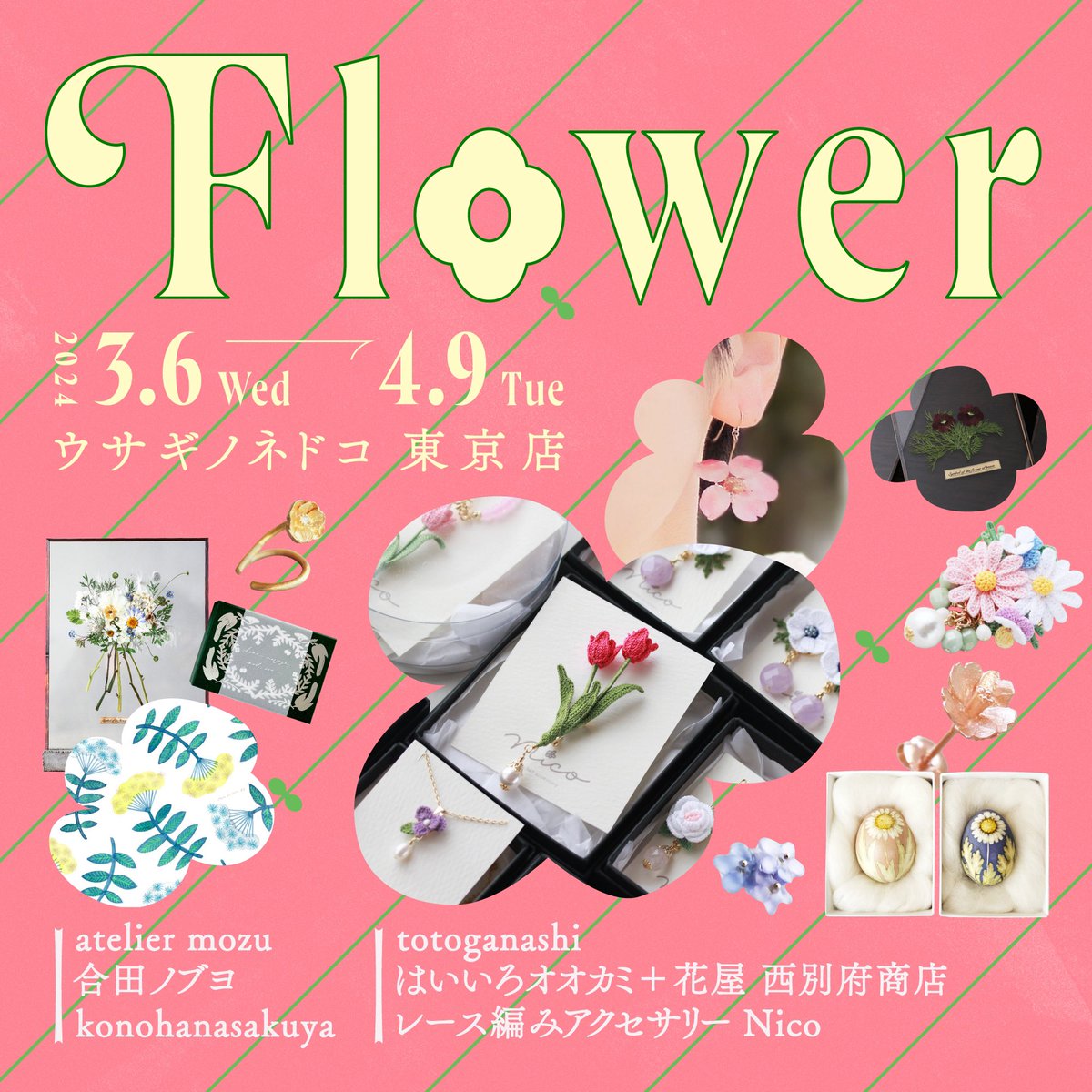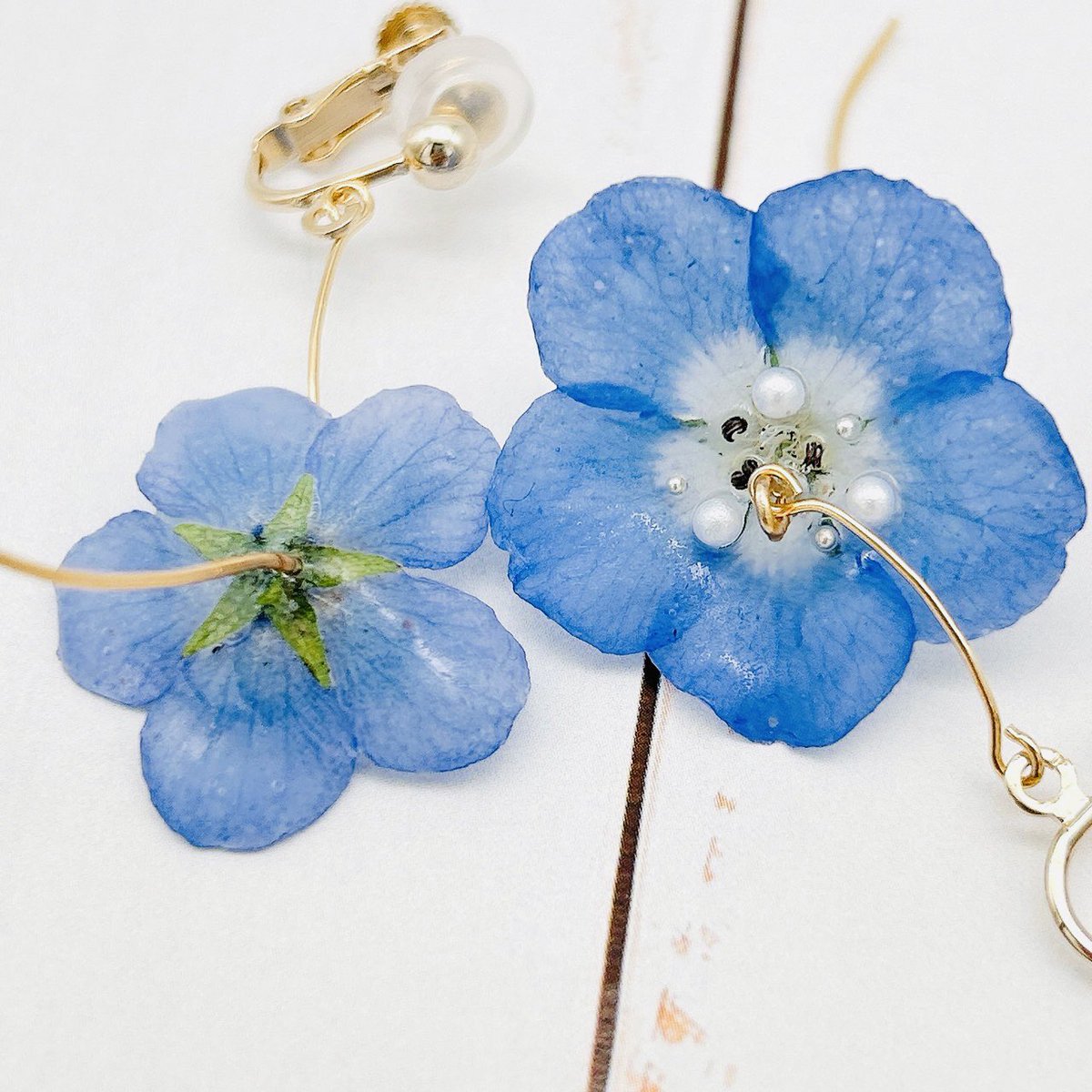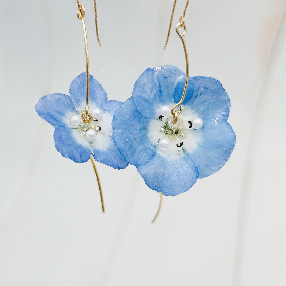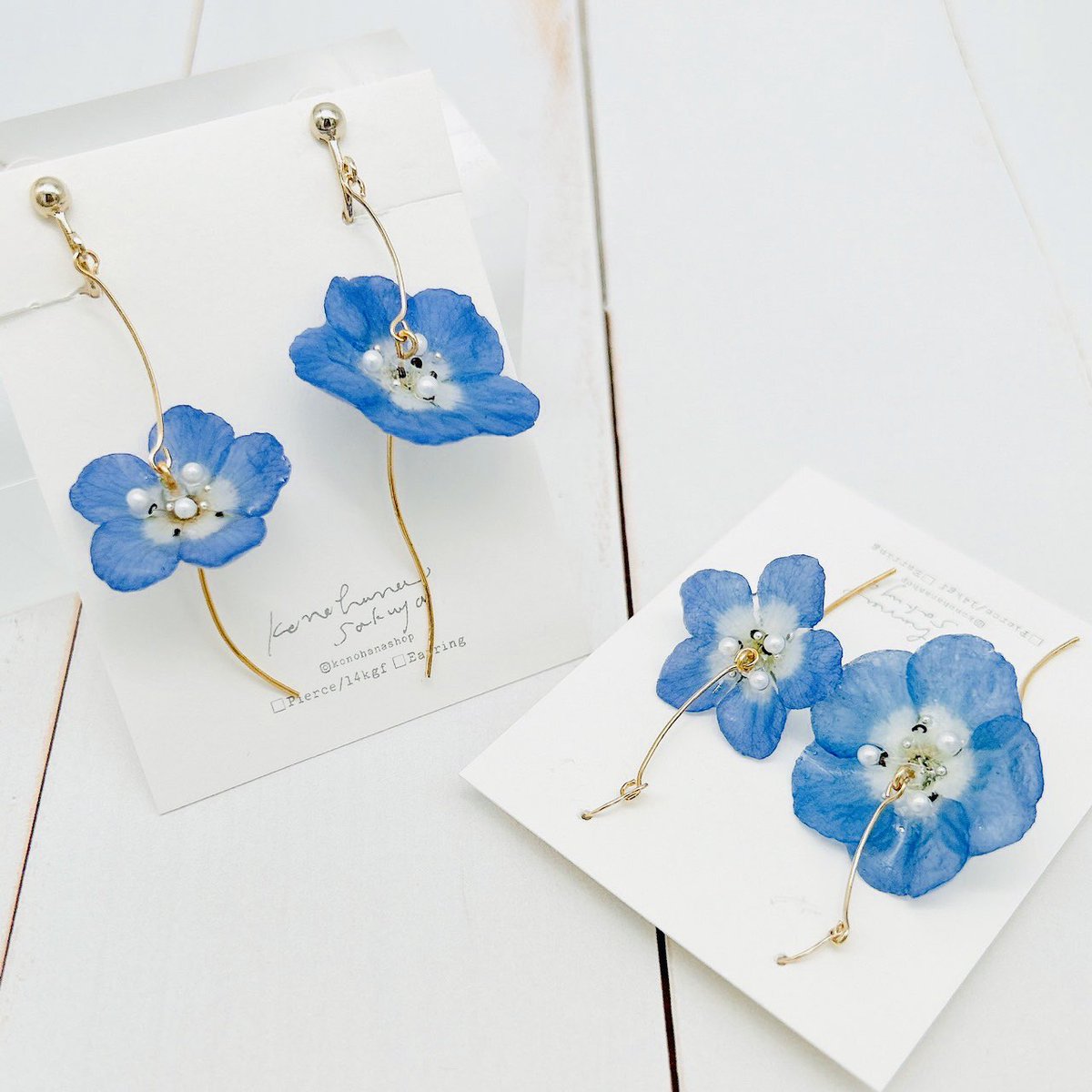 【Flower販売商品】ウサギノネドコ東京店では、konohanasakuya( @konohanaworks )の作品を販売しています。ご紹介の作品は、ネモフィラのピアスとイヤリング。儚げな青い花びらと、細いながらも太陽に向かって立つ優美な茎の姿を再現したデザインです。