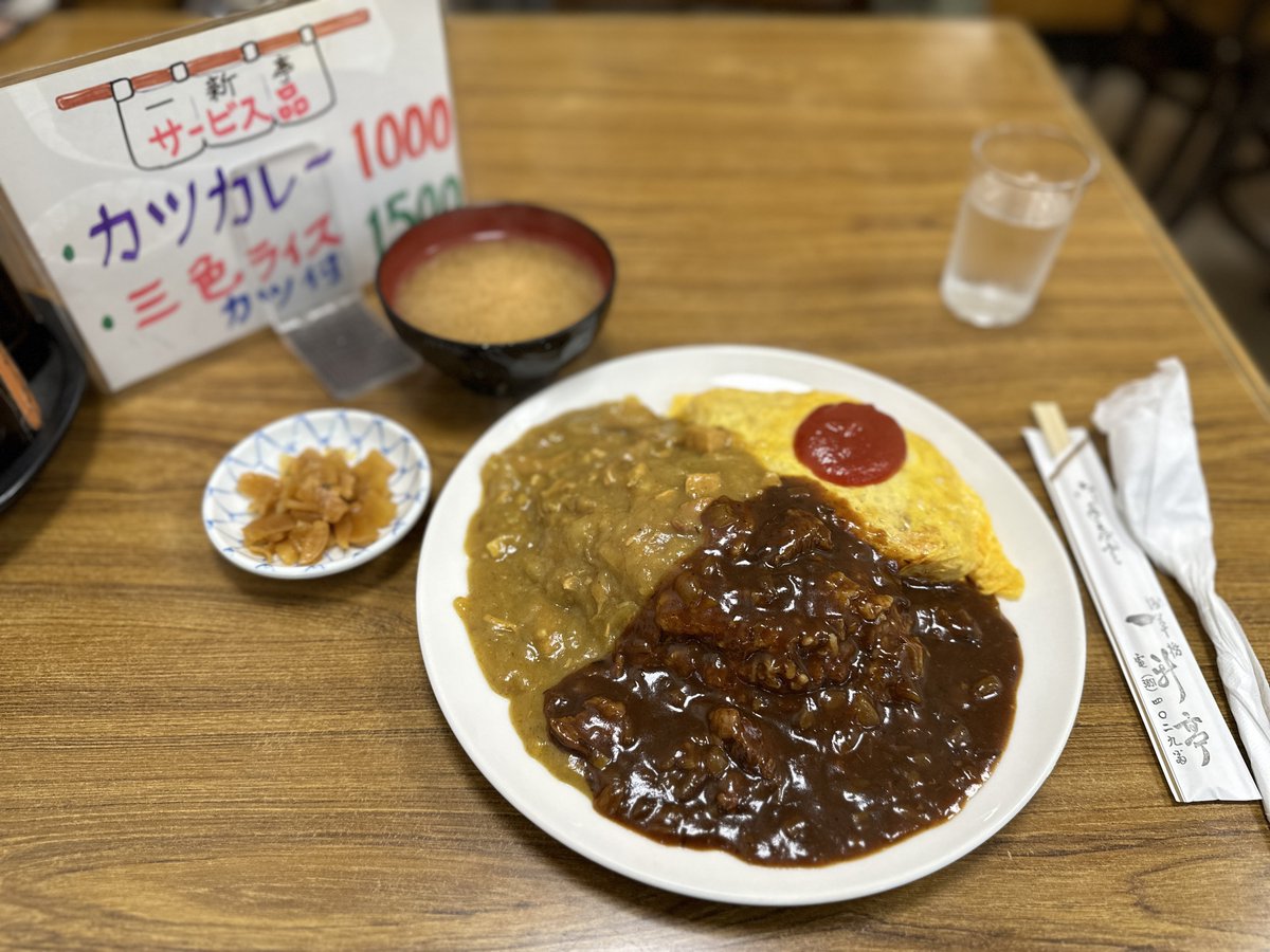 本日のお昼ごはんは、一新亭の三色ライス。相変わらずのボリュームと、スプーン止まらぬ美味しさ。ちなみに昼間からアサヒビールを呑むことも可能です。