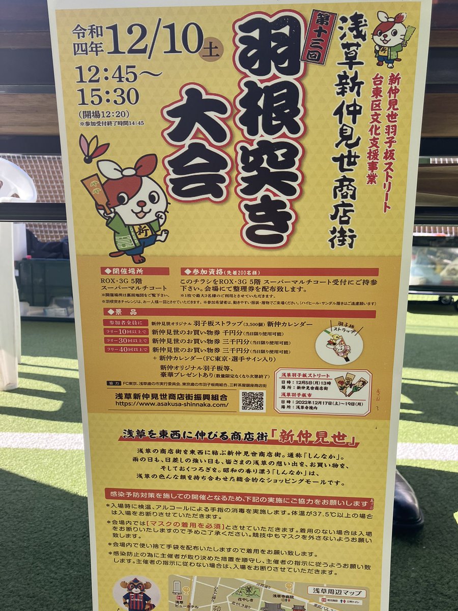 #浅草新仲見世商店街 の羽根突き大会が始まります。 #FC東京 のマスコット #東京ドロンパ も来場。 羽根突きのラリー回数に応じて、商品券などがもらえます。 #したまち発