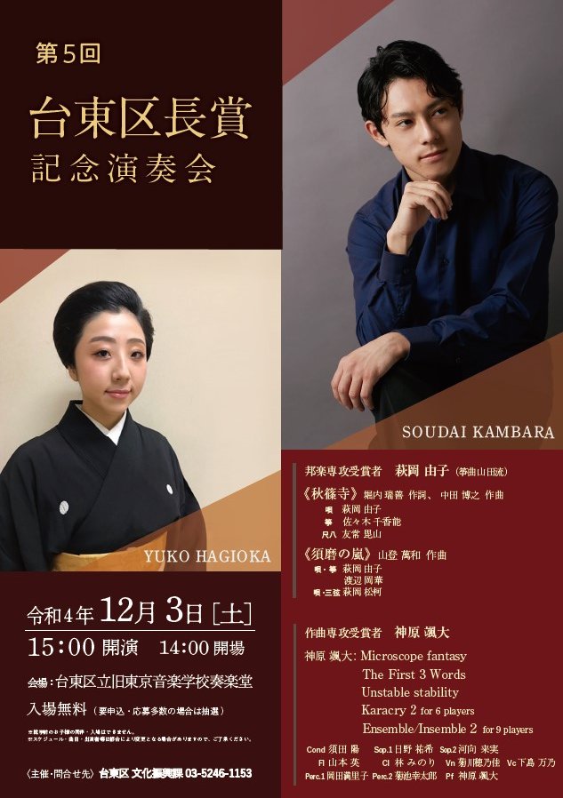 台東くん! 12月3日(土)に開催される、「台東区長賞記念演奏会」の参加者を追加で募集中パゴッ!🎶 若干数のみで先着順パゴッ!気になる人は早めに申込むパゴッ📝 出演者や申込方法等の詳細はリンク先を確認パゴッ👀 #藝大 #東京藝術大学 #上野