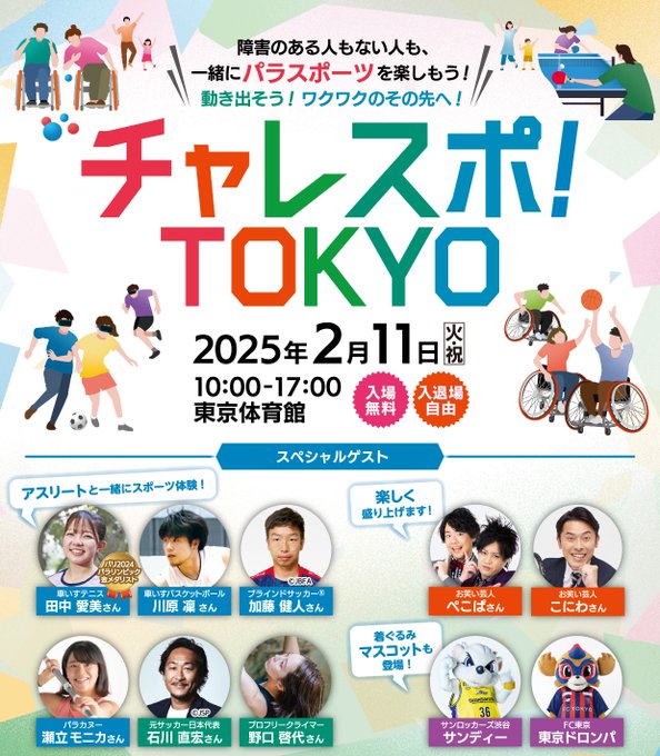 パラスポーツ参加体験型イベント「チャレスポ!TOKYO」を、2025年2月11日(火・祝)に東京体育館で開催します障害のある人もない人も一緒に楽しめるステージプログラムや追加ゲストを公開しましたご参加..