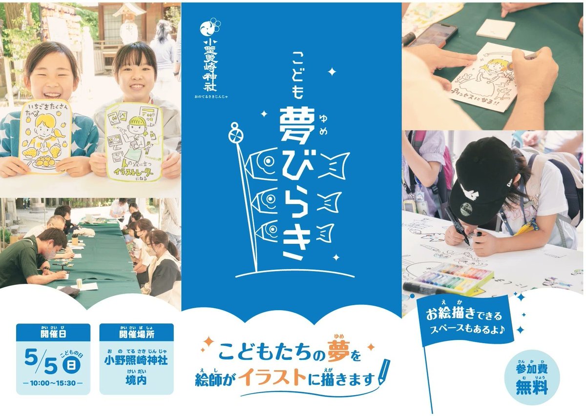 5月5日「こどもの日」🎏境内にて10-15時半まで、夢絵師がこども達の夢を描く『こども夢びらき』を開催します🎵絵師がお子様の願い事を伺って、似顔絵付きのイラストを描きますこの端午の節目の日にお祈りをい..