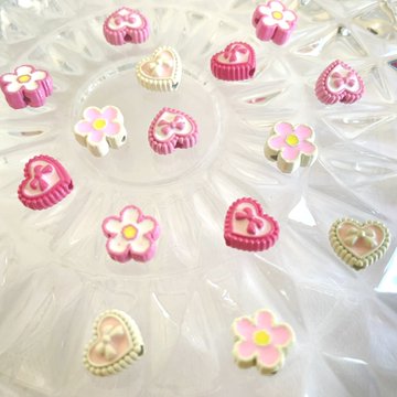 こんにちは 当店パステルカラーのメタルビーズが 多数入荷しております リボンや花、ハートなど 可愛い系が多く取り揃えてあります 種類はたくさんありますが、 残数が1〜2個のものが複数ありますので 取り置きなどもご検討ください