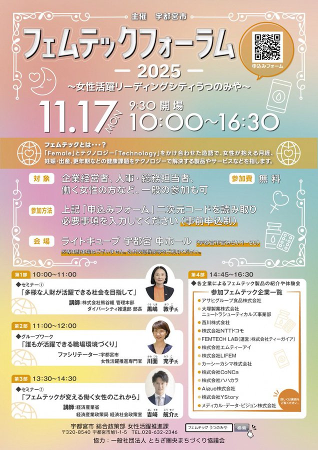 \フェムテックフォーラム2025参加者募集中/今話題のテクノロジーの力で女性の健康課題を解決するフェムテック今年度はフェムテック製品の紹介・体験会に加え、女性の健康支援に関するセミナーなどを行うイベン..