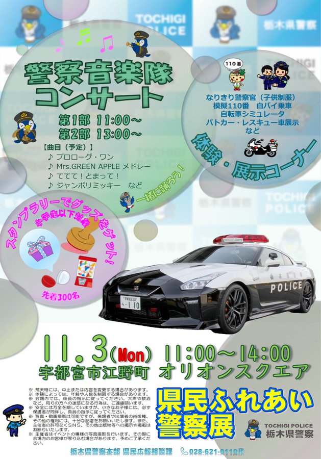 11月3日(月)午前11時から、宇都宮市オリオンスクエアにおいて、#県民ふれあい警察展が開催されます#音楽隊や#カラーガード隊の演奏演技や、自転車シュミレータ、模擬110番体験など、警察に関する様々な..