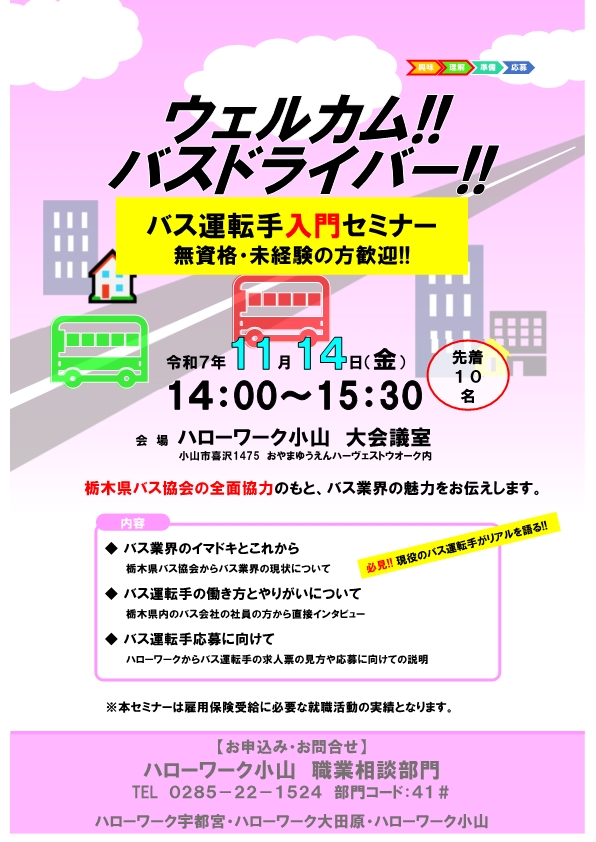 バス運転手入門セミナー開催11月14日(金)ハローワーク小山にて「バス運転手入門セミナー」を開催いたします。栃木県バス協会の全面協力のもと、現役のバス運転手の方からバス運転手の魅力とリアル、これからの..