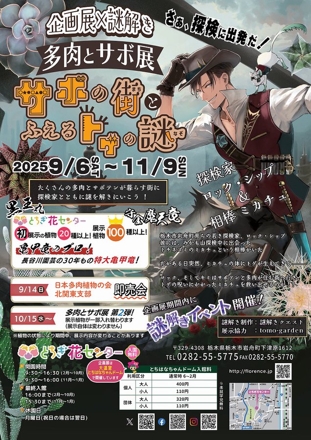/#とちぎ花センター企画展「多肉とサボ展サボの街とふえるトゲの謎」\個性豊かな多肉植物やユニークな形の#サボテンが大集合ストーリー仕立ての#謎解きイベントも同時開催会期:11/9(日)まで料金:大人4..