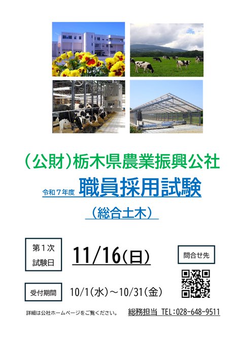 総合土木技術者の採用試験を実施します。畜産・農用地等に関する専門的な業務に従事します。応募受付は10/31(金)までです。興味のある方、エントリーしてみませんか。 #栃木 #農業 #食育 #新規就農 #農地 #畜産 #総合土木技術者