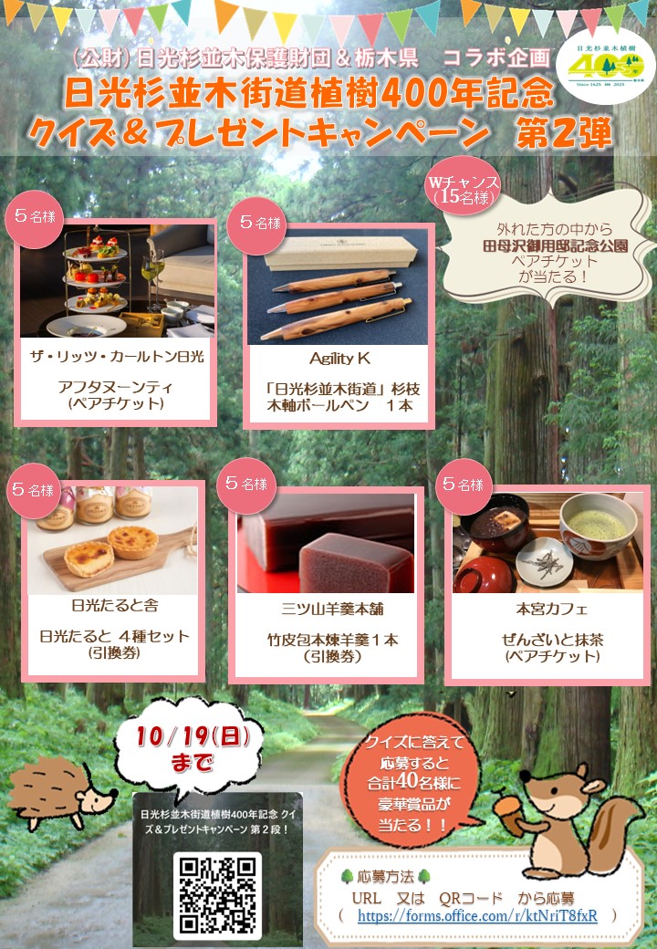 /日光杉並木街道植樹400年記念クイズ&プレゼントキャンペーン第2弾\植樹開始から400年を記念してプレゼントキャンペーン開催中クイズに答えてプレゼントに応募しよう詳しくはこちらhttps://pre..
