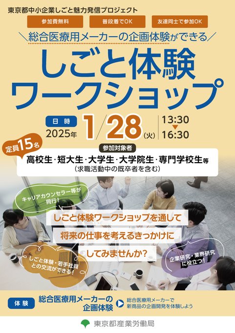 /就活に役立つ「しごと体験ワークショップ」申込受付中\キャリアカウンセラー等と企業を訪問し、しごと体験&社員交流!日時:2025年1月28日(火)13:30~16:30体験内容:総合医療用メーカーの企..