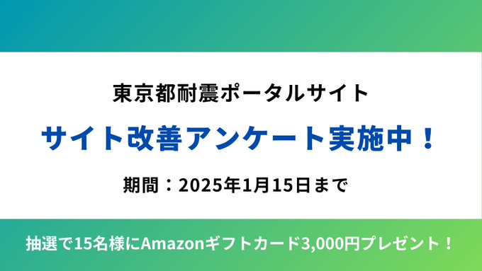 現在、東京都耐震ポータルサイトでは、「サイト改善のためのアンケート」を実施中です。ぜひ、皆様の声をお聞かせください!回答時間:約3分募集期間:2025年1月15日(水)23:59まで回答はこちら[ht..