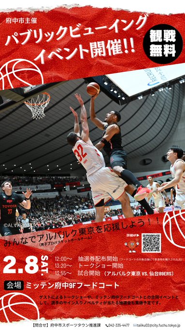 \\\お知らせ///パブリックビューイングの開催決定#アルバルク東京を応援しよう!!◼︎2/8(土)13:20-トークショー、13:55-試合開始◼︎vs仙台89ERS◼︎ミッテン府中9Fフードコート..