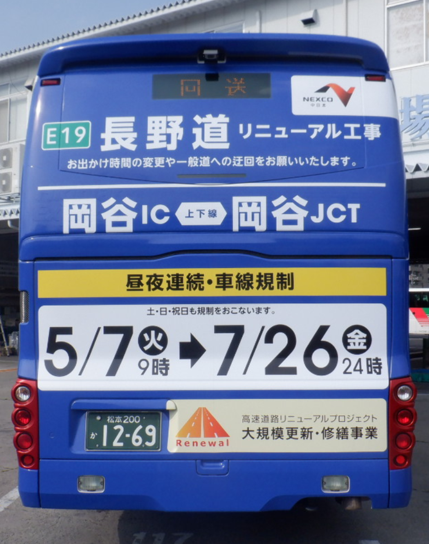 【#長野道 リニューアル工事】 アルピコ交通(@ALPICO_express)様の #高速路線バス(松本・諏訪~新宿間)にて、お知らせしています。 長野道の道路カラーを使用したバスは、初登場です。 台数が少ないことから、レアなバスになっています。 しかも、バスの後方からしか分かりません。…