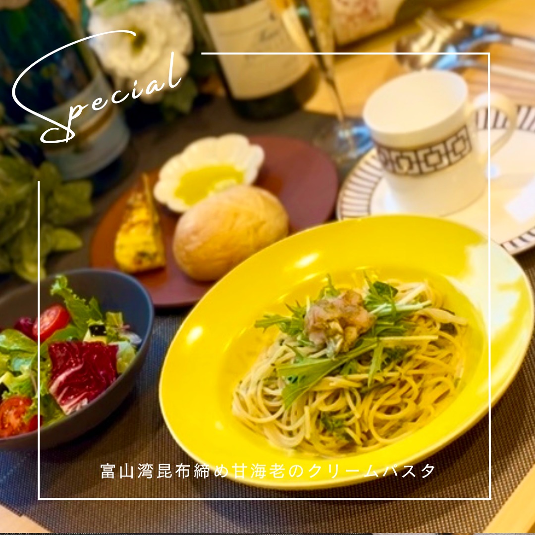 【昆布締め甘海老のクリームパスタ】富山県の郷土料理である昆布締め。富山湾のプランクトンを豊富に食べ..