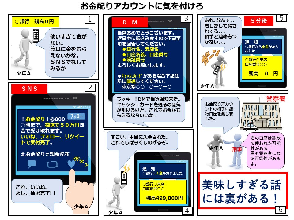 お金配りアカウントに注意!#詐欺などの犯罪に利用するために「お金を配る」という名目で銀行口座を聞き出すSNSアカウントが存在します。若者が安易にやりとりをして被害にあうケースが多くなっています。銀行口..