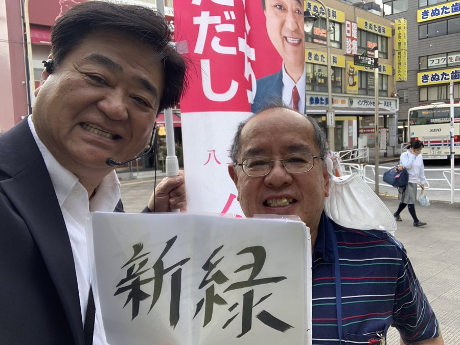 6月6日おはようございます「あなたの相談窓口“とぐち”です」今朝は、予報ですJR西八王子駅南口からスタート久しぶりに佐藤さんとのツーショット〝新緑〟の揮毫を頂きました。いつも激励ありがとうございます今..