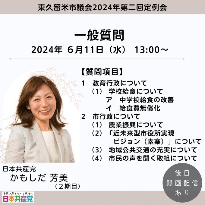 本日、質問を終えました。中学校給食の質問で時間を使ってしまい、他の再質問があまりできなかったのが反省です後日、録画配信がされる予定です。