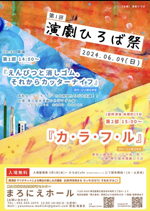 今日は「第1回演劇ひろば祭」(入場無料@まろにえホール)を鑑賞。主催は東久留米市内で演劇を基礎から教えている演劇ひろばさん。こどもたちとマダムたちの熱い演技に感動しました。次回も楽しみにしています。#..