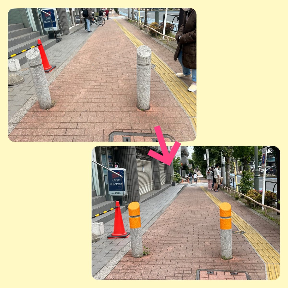 #東久留米駅東口ロータリーから少し先の車止め。視覚障害のある方より、コンクリート製の車止めが良く見えずぶつかってしまったとのこと。特に夜間は見えづらいですね。担当課に繋げました。上部に濃い黄色が塗られ..