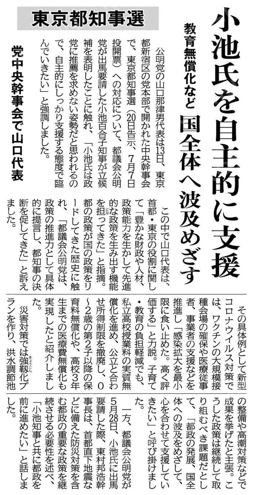 (東京都知事選)小池氏を自主的に支援/教育無償化など国全体へ波及めざす/党中央幹事会で山口代表#公明新聞電子版2024年06月16日付https://komei.or.jp/newspaper-app..
