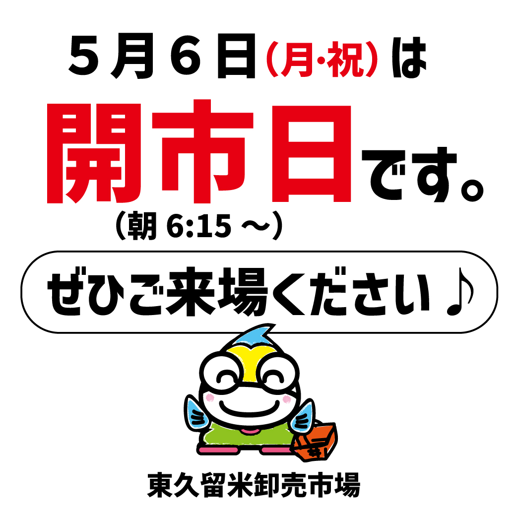 こんにちは🌞東久留米市場です!明日5/6(月・祝)は朝6:15より通常営業いたします。ぜひご来場ください!!#開市日#東久留米市場#東久留米卸売市場01128